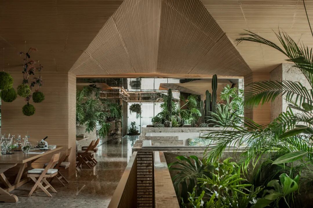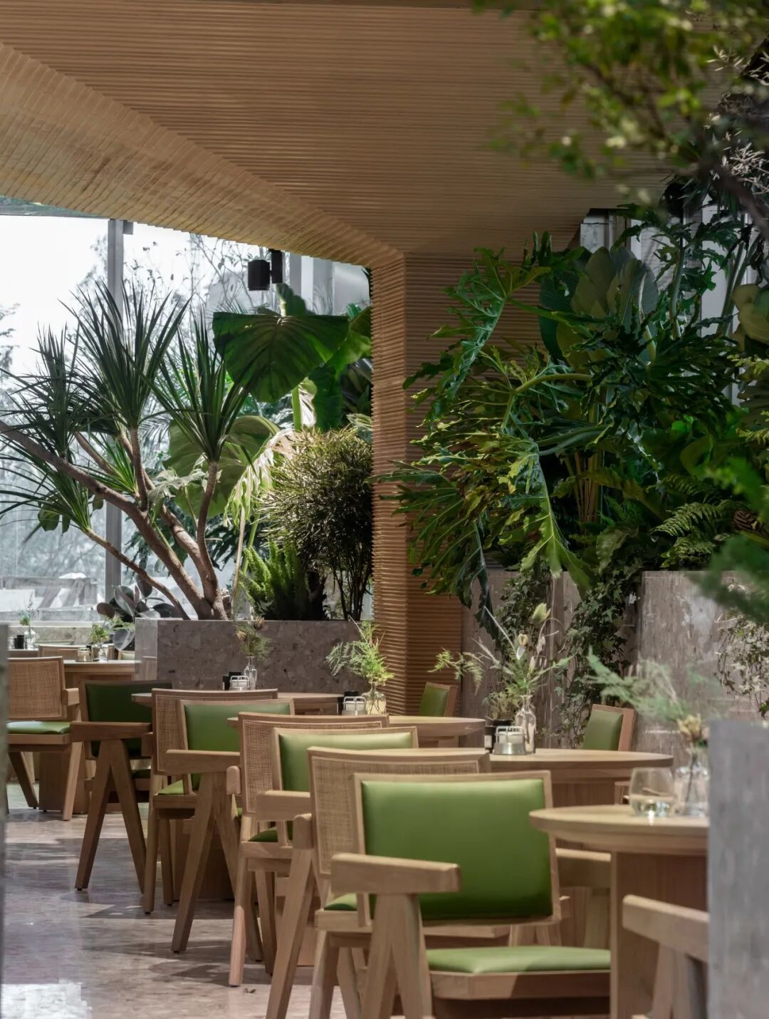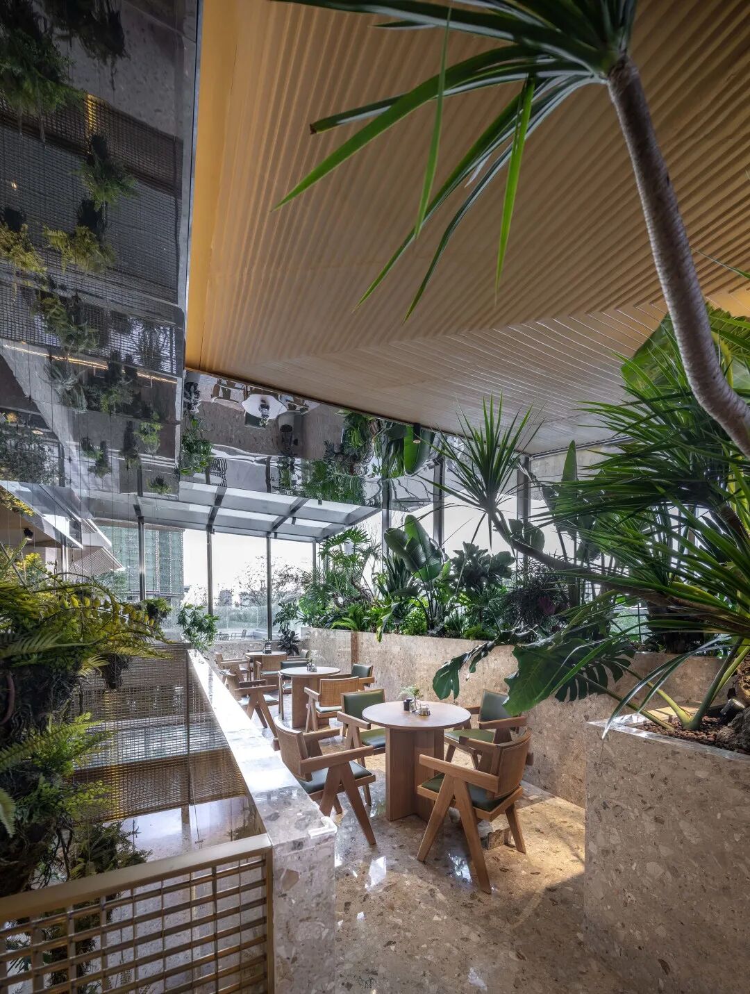 在场所氛围营造上,以绿植为生命单元的要素同样大量运用于室内,高透射的超白玻璃幕墙对室外绿植的视觉导入,以及高反射的镜面不锈钢对室内外植物景观的衬映叠加下,建筑的内外氛围形成了高度的连贯,真实的绿植和影像的绿植渗透叠加,非日常的自然体验由此而生。 ![]()