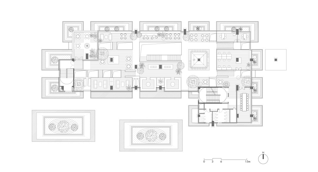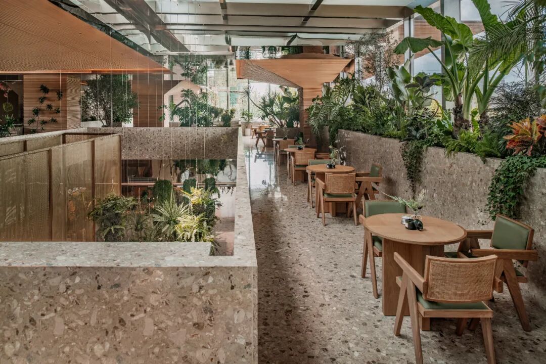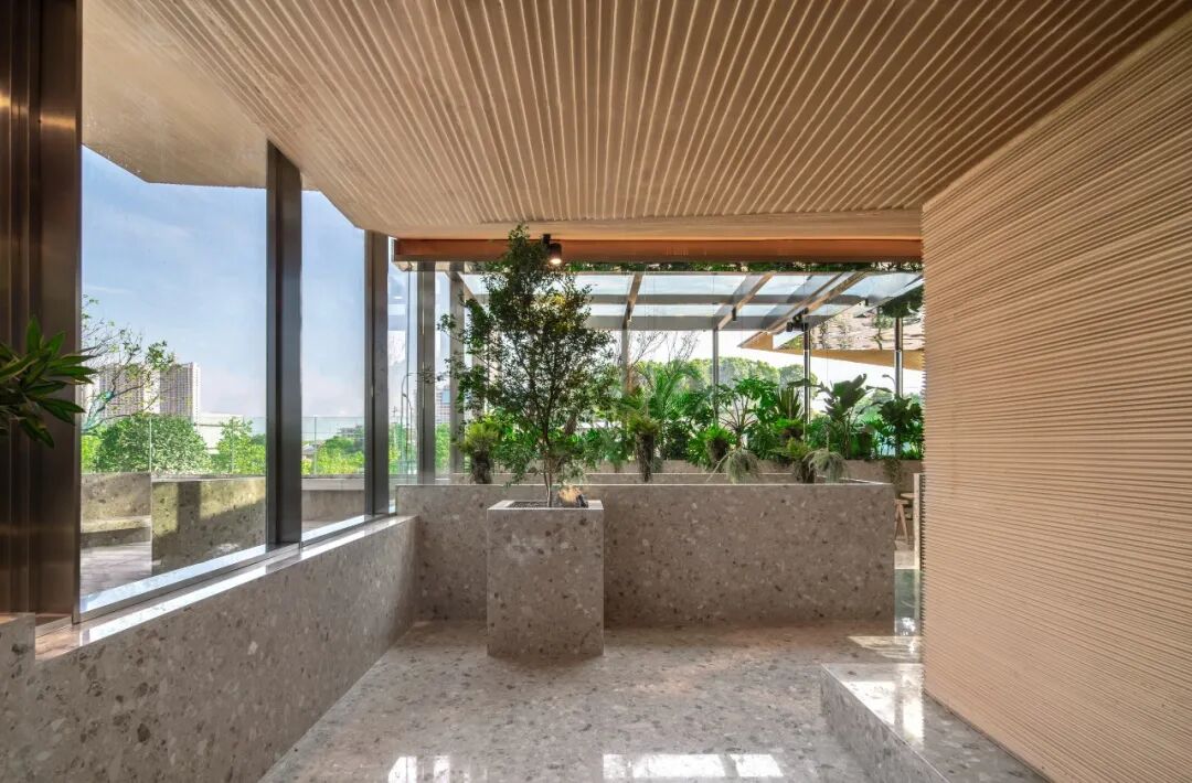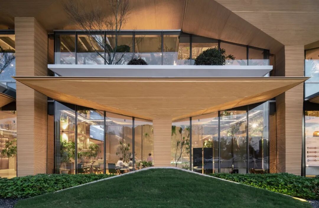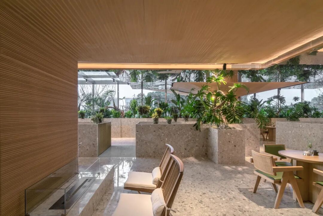 在场所氛围营造上,以绿植为生命单元的要素同样大量运用于室内,高透射的超白玻璃幕墙对室外绿植的视觉导入,以及高反射的镜面不锈钢对室内外植物景观的衬映叠加下,建筑的内外氛围形成了高度的连贯,真实的绿植和影像的绿植渗透叠加,非日常的自然体验由此而生。 ![]()