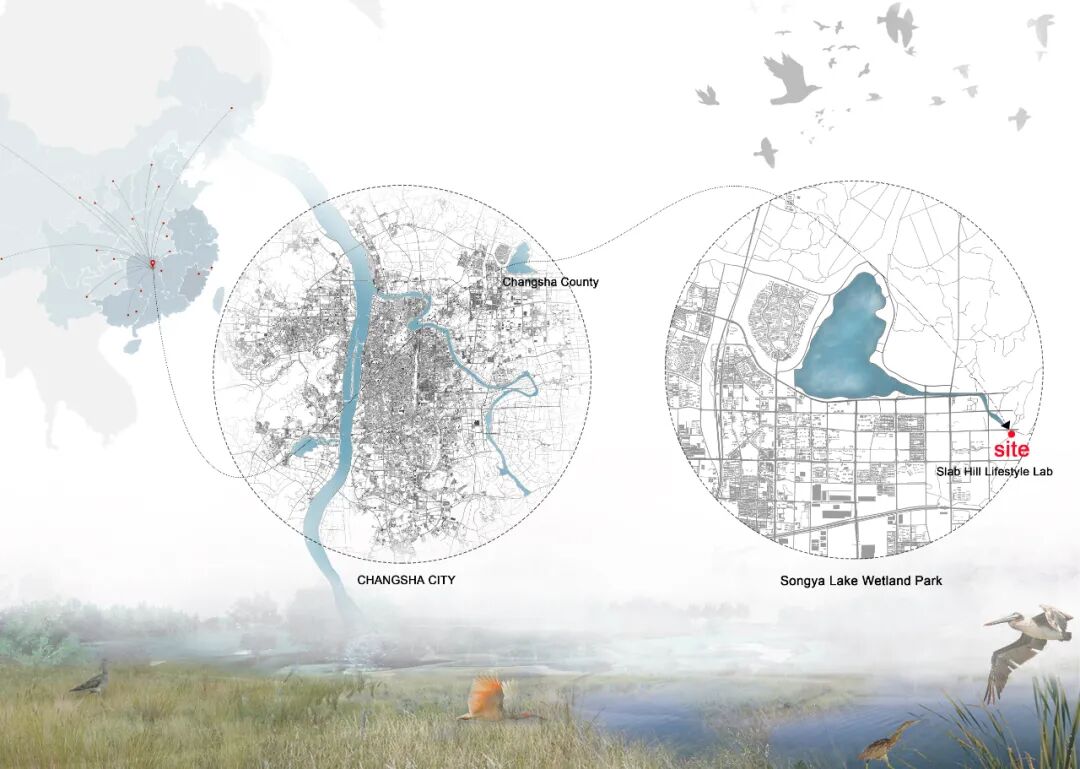 项目所在地距湖南长沙松雅湖国家湿地公园约2公里处,基地从东、北两侧被两条城市主干道路所包围,南侧紧邻规划中的开发中的高密度社区,西侧贴临自松雅湖湿地流域扩散而出的城市河道,场地周边普遍呈现出快速城市化过程中人工与自然碎片化交织的环境。面对这一缺乏场地特质的用地条件,我们意图通过植入一座小小的异质“山丘”——“伞之丘”,来激发这一日常的城郊风景。