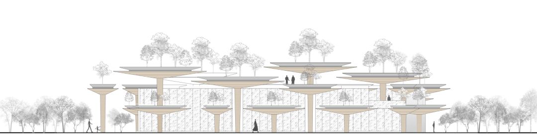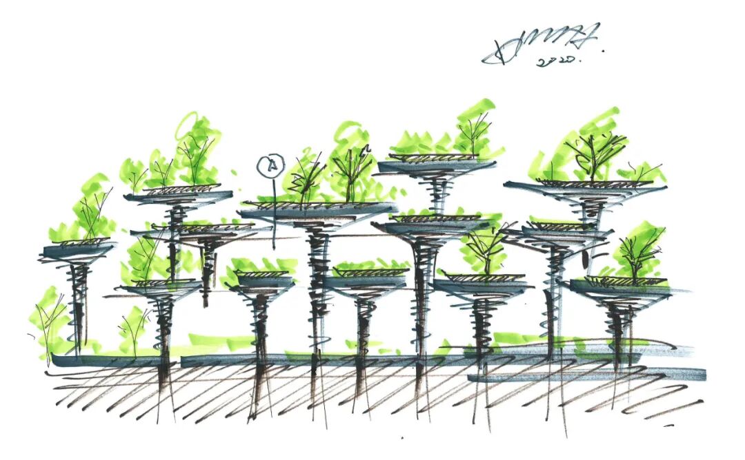 △ 概念草图顾名思义,“伞之丘”即是以伞状结构单元为原型生长而来的人工山丘。之所以选择这种伞状结构作为结构原型,一方面是因为其清晰简明的“伞柄-伞盖”结构支撑体系和大范围的空间覆盖所形成的领域感,另一方面则是因为伞状是植物界中的普遍存在——小到各种伞状菌类,大到龙血树等各种树木——的仿生特质。