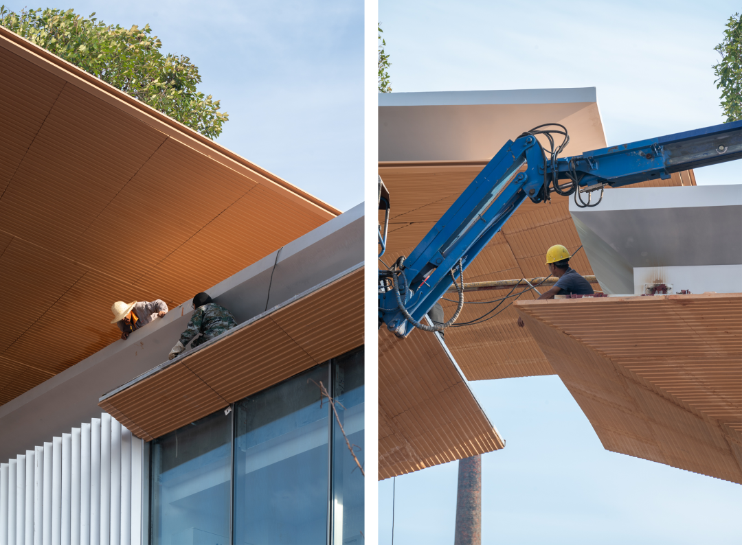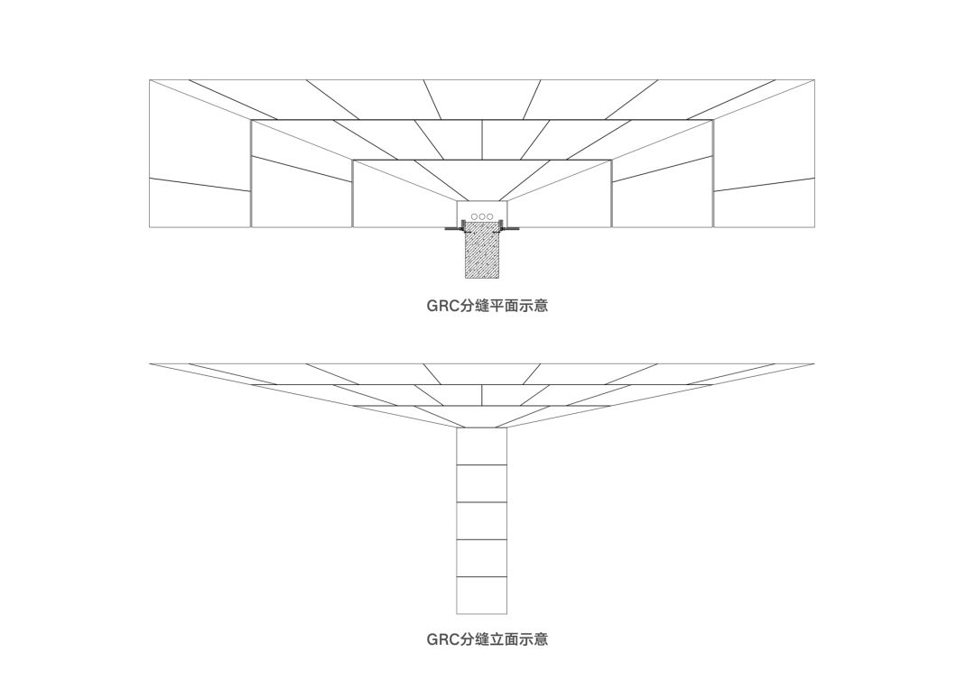 △ GRC挂板的多阶段探索在实际的建造过程中,混凝土浇筑形成的伞状结构,在技术上为保证各单元的纹理模数,为每个伞状结构单独开模预制GRC挂板,以及通过分缝设计使其具备开缝展示的条件,同时规避打胶对视觉品质的负面影响。![]()
