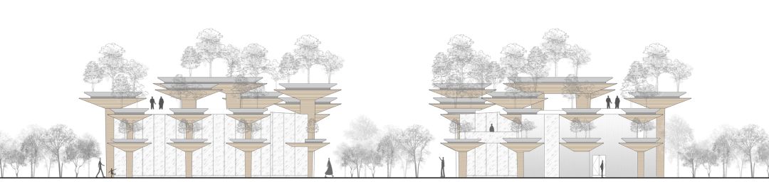 由于场地限制和商业容量的双重要求,部分建筑功能需要垂直布置。考虑到多层建筑的楼板置入问题,我们依据一定的规律对伞面以错层的方式进行再组织,在统一的空间整体秩序下,通过局部的异化打破均质的状态,重复而又变化的空间秩序也是与自然的随机性相联系,产生自由多变的场所氛围。
