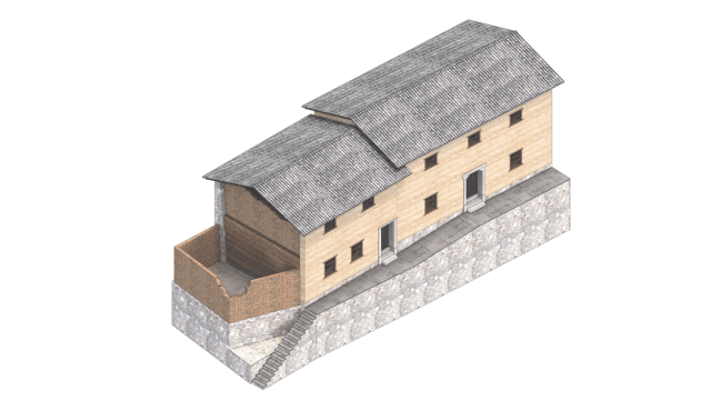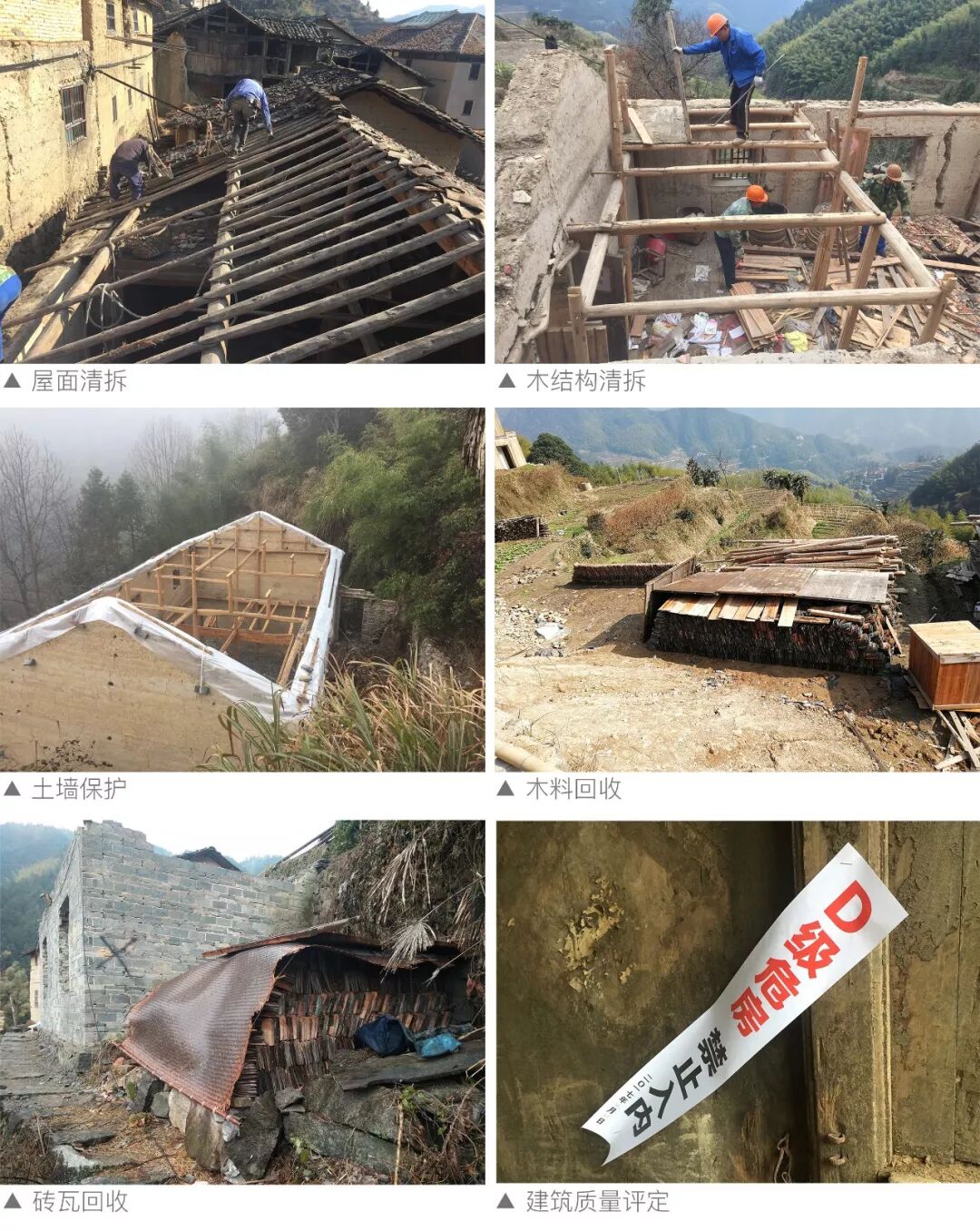 首先,对原有夯土农居做建筑质量评定,存在安全隐患的部分予以拆除。建筑质量较好的保留并修缮加固,回收利用拆除下来的木材、青瓦、砖石等材料。