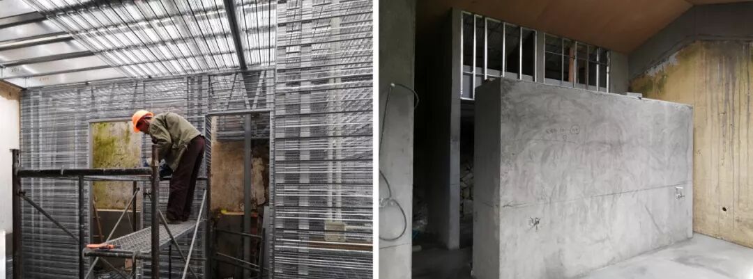 改造方案采取建筑-室内一体化设计施工,因此室内隔墙、楼梯、管线预埋等均可以在工厂预先加工完成,现场装配组装,保证施工精度。室内墙体以C型轻钢作为龙骨,金属网板支模,内部填充EPS发泡混凝土。自重轻,保温隔音效果好,施工便捷。