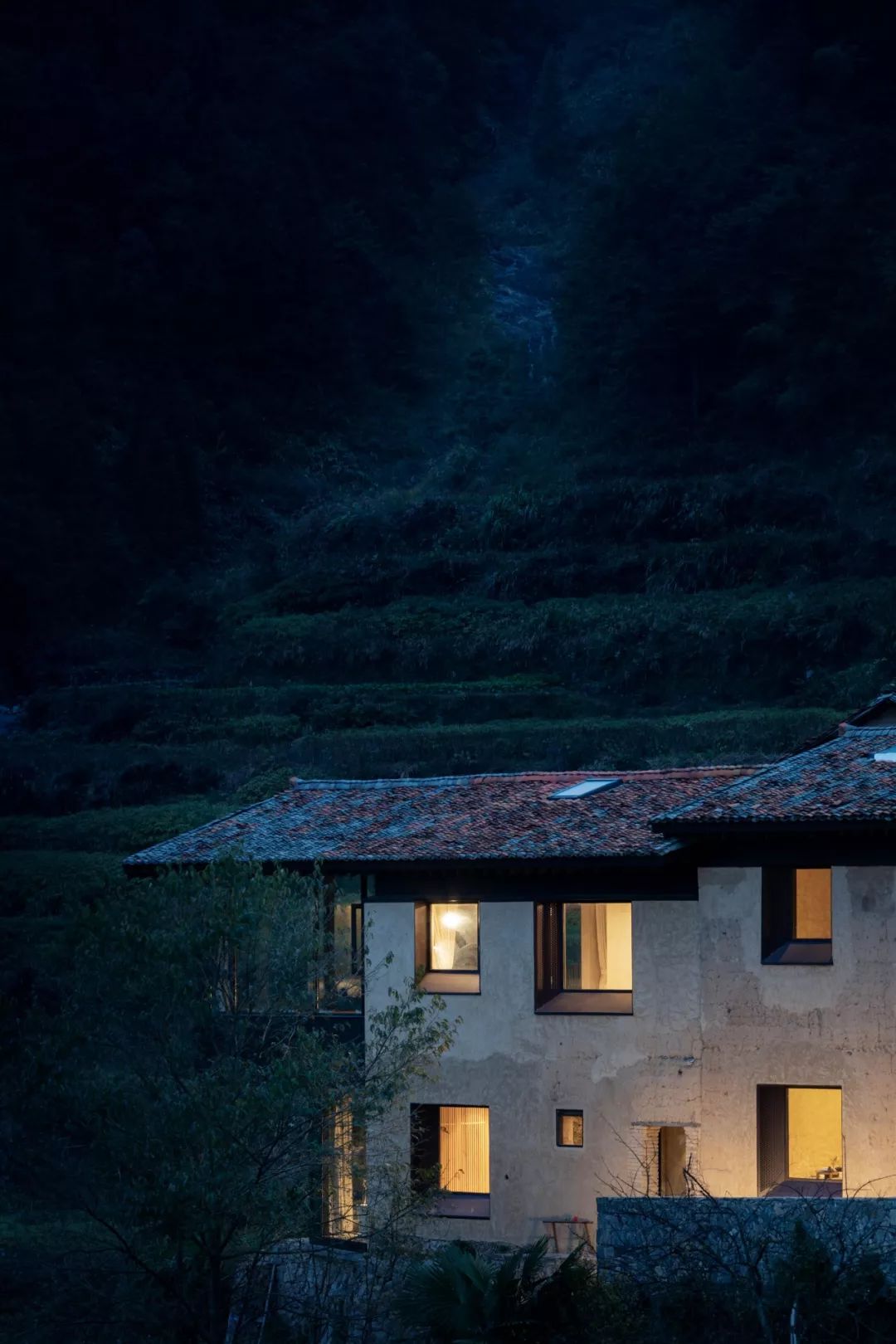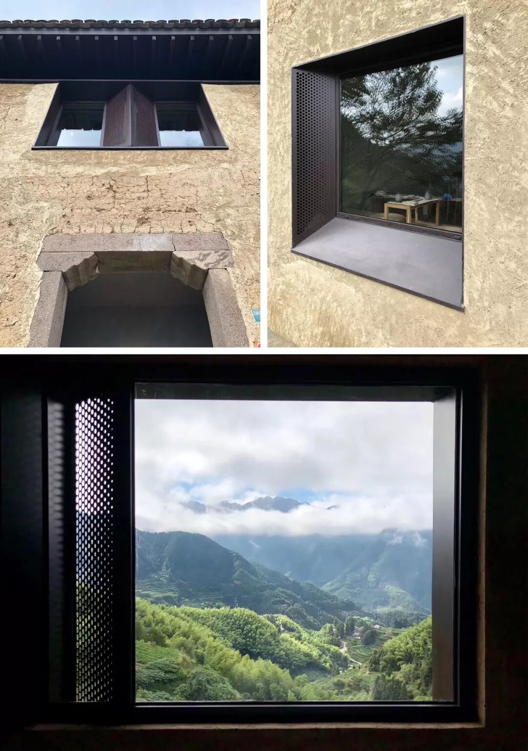 传统民居的开窗洞口较小,无法满足客房室内空间对于光照、通风和景观收纳等方面的需求。为了改善建筑内部的光照环境和景观视野,设计中对原有门窗洞口进行了扩大处理,安装现代门窗系统。确保外围护结构的密闭性,增强保温隔热性能。特殊设计的铝板穿孔窗框,既能提供室内通风,又保证了外立面简洁统一。