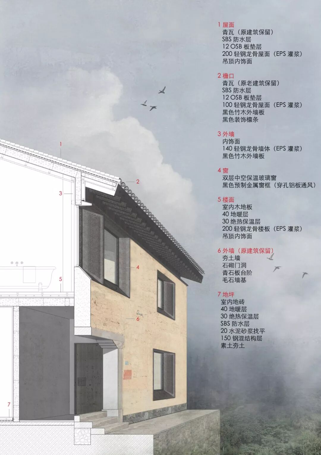 材料:夯土、毛石、轻质混凝土、竹木外墙板、玻璃、铝板
