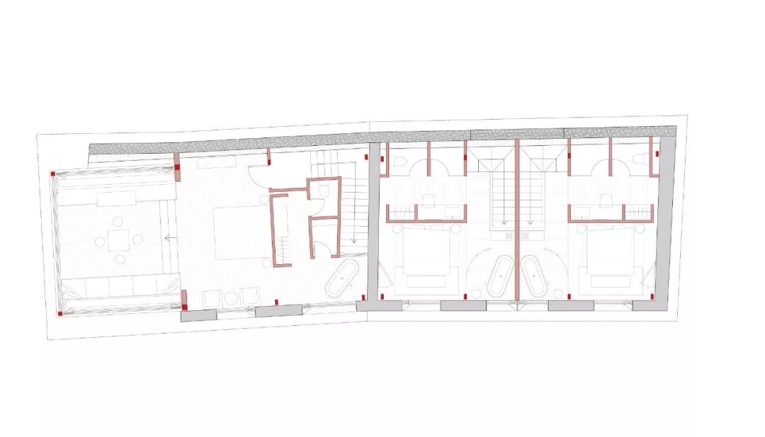 2号楼南侧紧靠道路,考虑到居住空间的私密性,将客房设计为LOFT空间,底层为起居厅,靠窗设置景观卧榻。二层为卧室,床和浴缸皆面向外部风景。