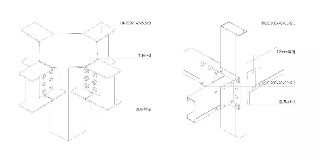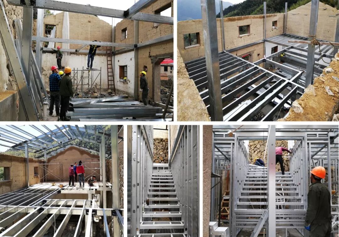 项目地处偏远山区,交通运输不便,大型建筑机器无法进入,对于传统民居的现代空间改造提出了更高的要求。为了应对严峻的施工环境,设计首先从结构形式入手,综合各种因素,决定采用新型轻钢装配式结构体系。结构梁柱为截面尺寸200*90mm的基本单元杆件,由两根壁厚2.5mm的C型钢合抱弦扣而成,冷轧成型。杆件之间螺栓连接,无需焊接。最小化的结构单元,能够解决运输难题;高度的预制率和连接方式,便于现场施工安装。