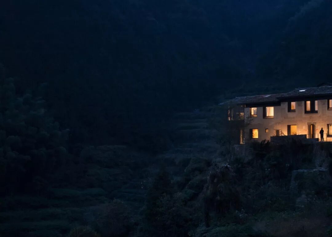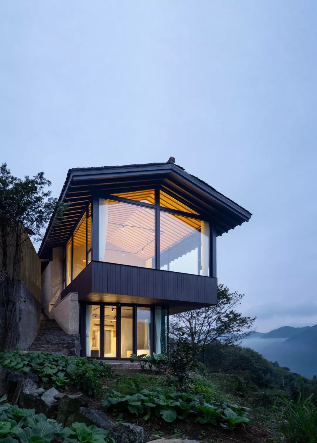 原有老建筑的层高低矮逼仄,无法满足现代居住空间的需求。因此我们将原有建筑屋面整体抬高,高度合理分配至上下两层,为室内设备安装预留空间,同时创造舒适的居住体验。1号楼的最西侧,原有砖砌柴房已坍塌破损,荒草丛生。我们依照原有宅基地范围修建,并且在二层悬挑一个玻璃体量,既可以作为室内空间的延伸,又能更好地收纳峡谷景观。