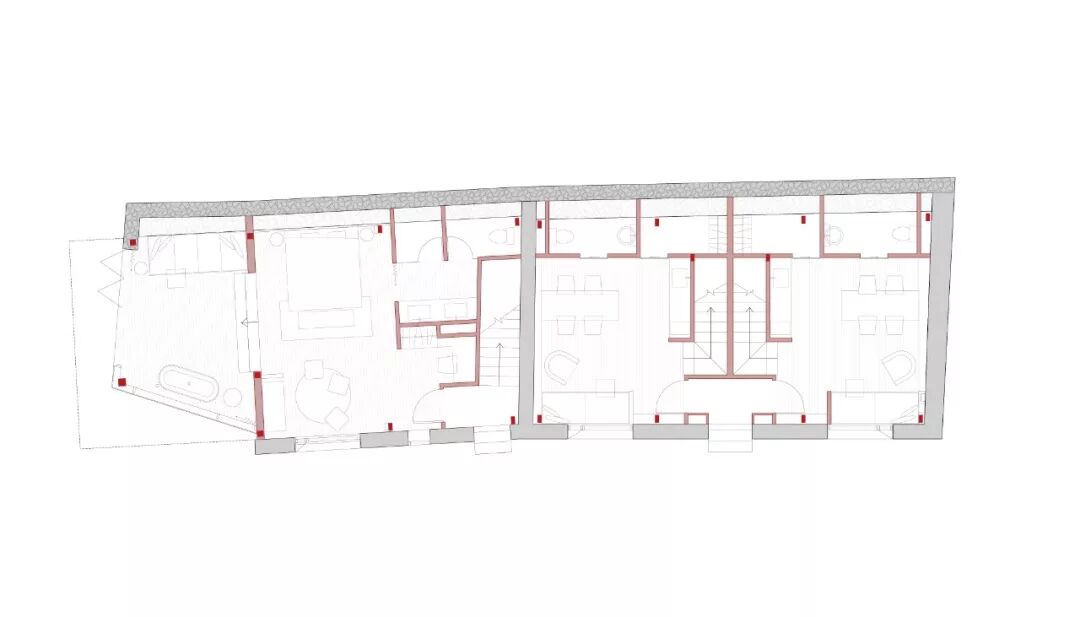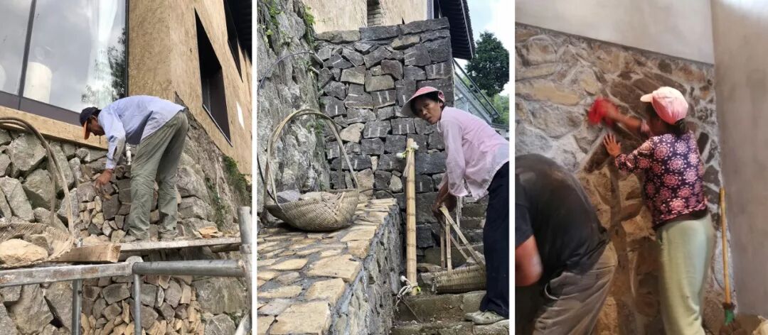 村庄内乡土民居顺应地形地貌,依山而建,多数房屋背靠山体的一侧,围护外墙直接采用毛石砌筑的护坡挡墙。设计中希望保留这一表达地域建造特点的构造。首先要对存在结构隐患的石墙修缮加固,确保结构稳定性;山地土层含水量高,石墙会出现渗水现象,在基础施工阶段,预埋排水管起到引流作用。石墙内部灌浆处理,填补缝隙,刷防水涂层,营造舒适的室内居住环境。