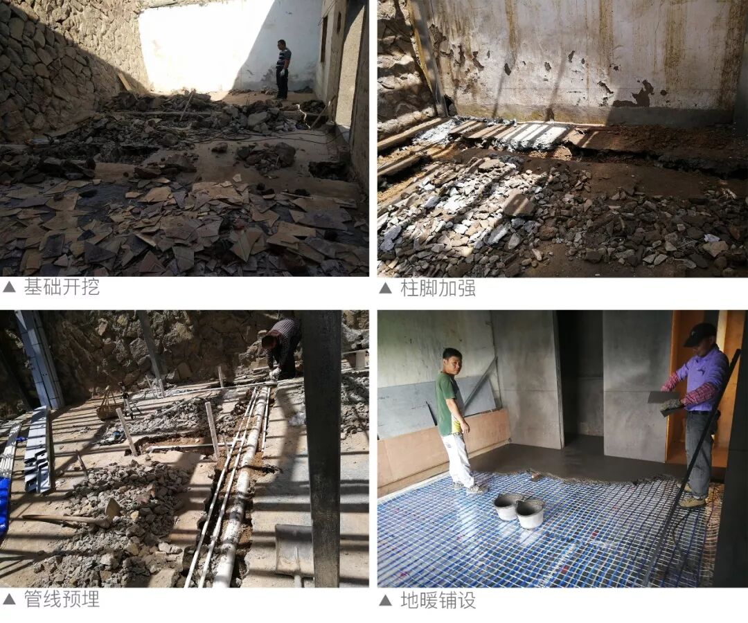 复核原建筑基础尺寸,保证新建结构在原址范围内,确保基础土层稳固。采用平板基础,柱脚范围结构加强。基础与土墙预留安全距离,保证土墙的安全稳固和施工操作空间。预埋综合管线,铺设地暖。
