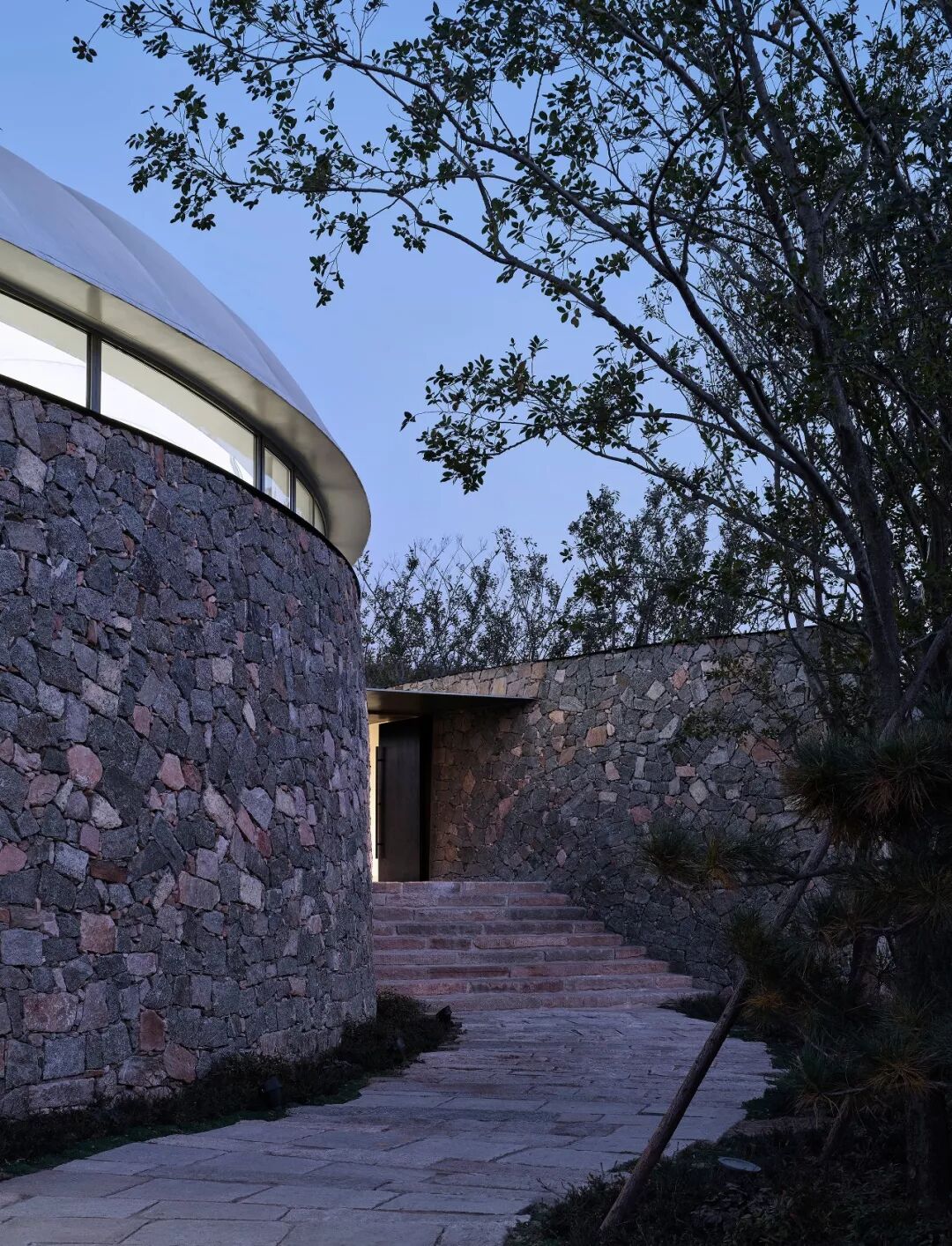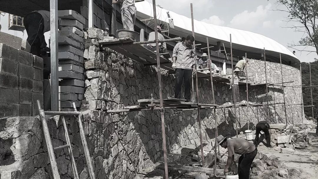 毛石墙与屋面之间的条形玻璃高窗,垂直方向上自然过渡“重”与“轻”,既满足了室内自然通风和采光的需求,又营造了一种毛石墙与白膜屋面之间想要挣脱,却又相互牵连的暧昧关系。
