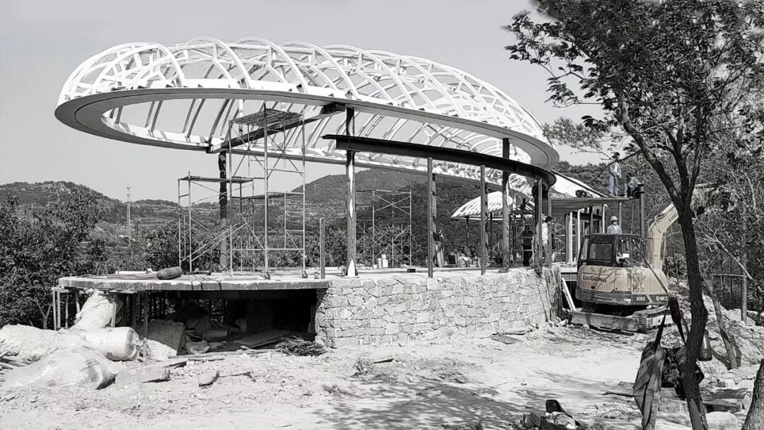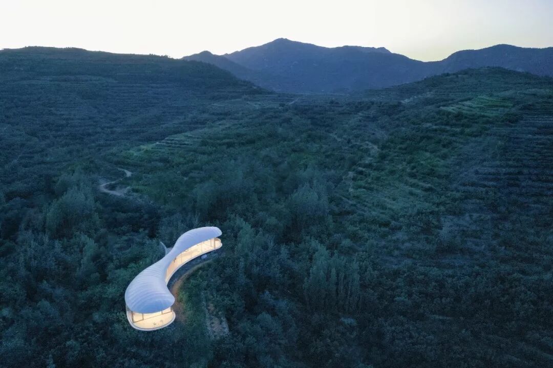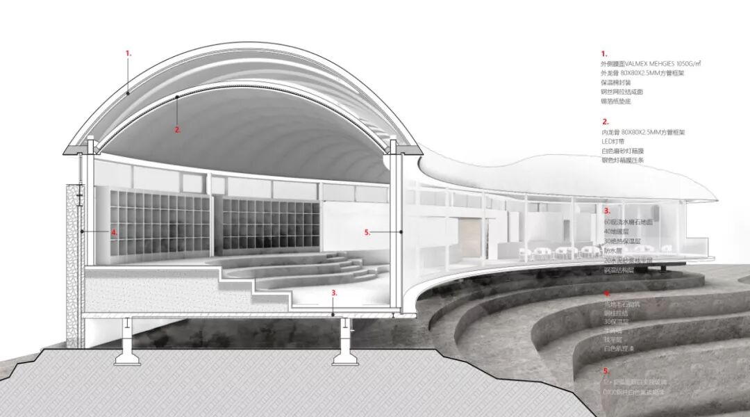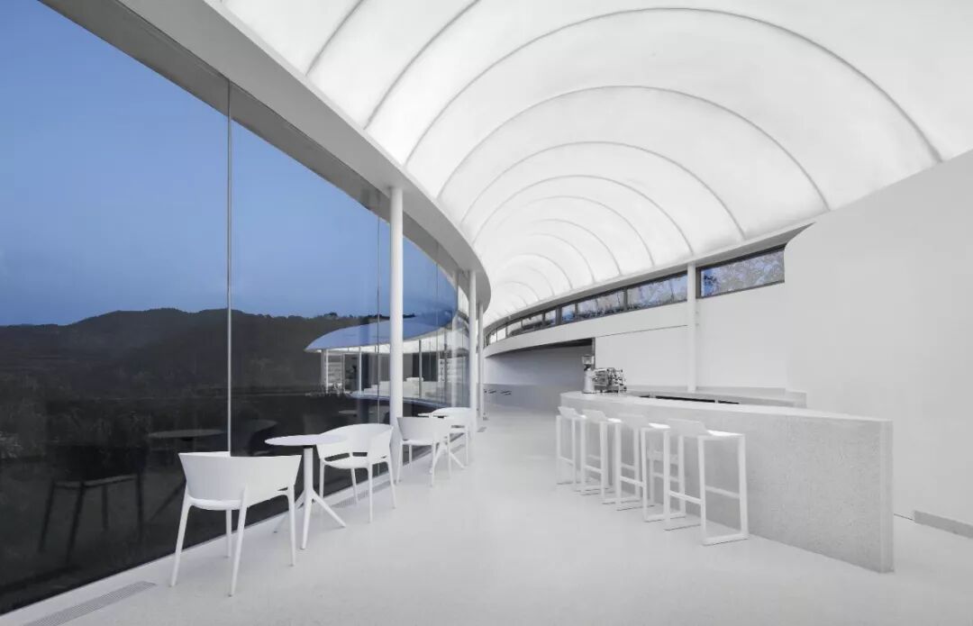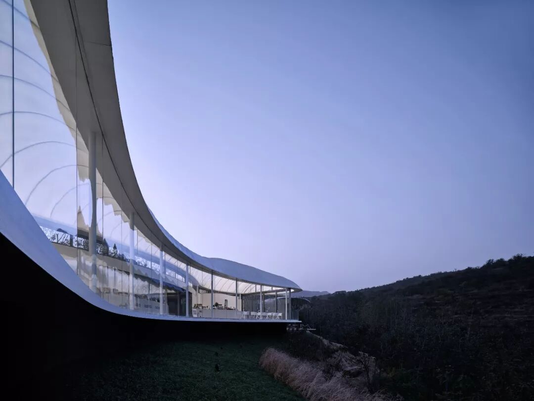 主体建筑选用的轻钢与膜结构体系具有结实可靠又轻巧的特性,使设计得以依山就势在山顶以自然曲线勾勒出轻薄舒展的造型。