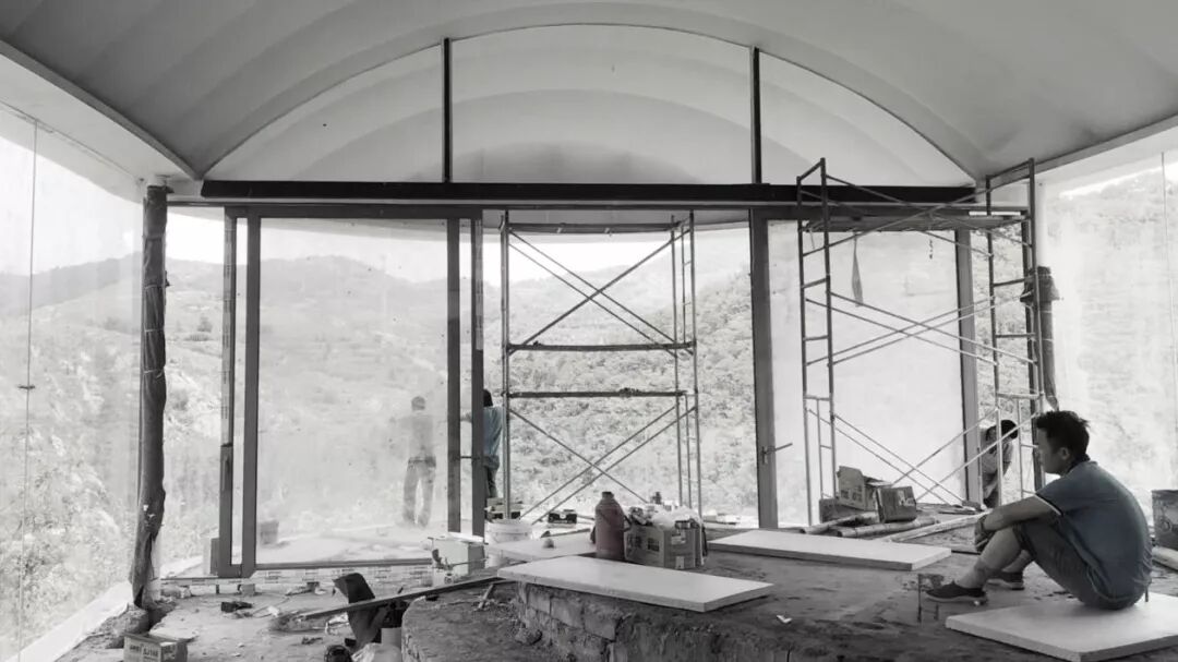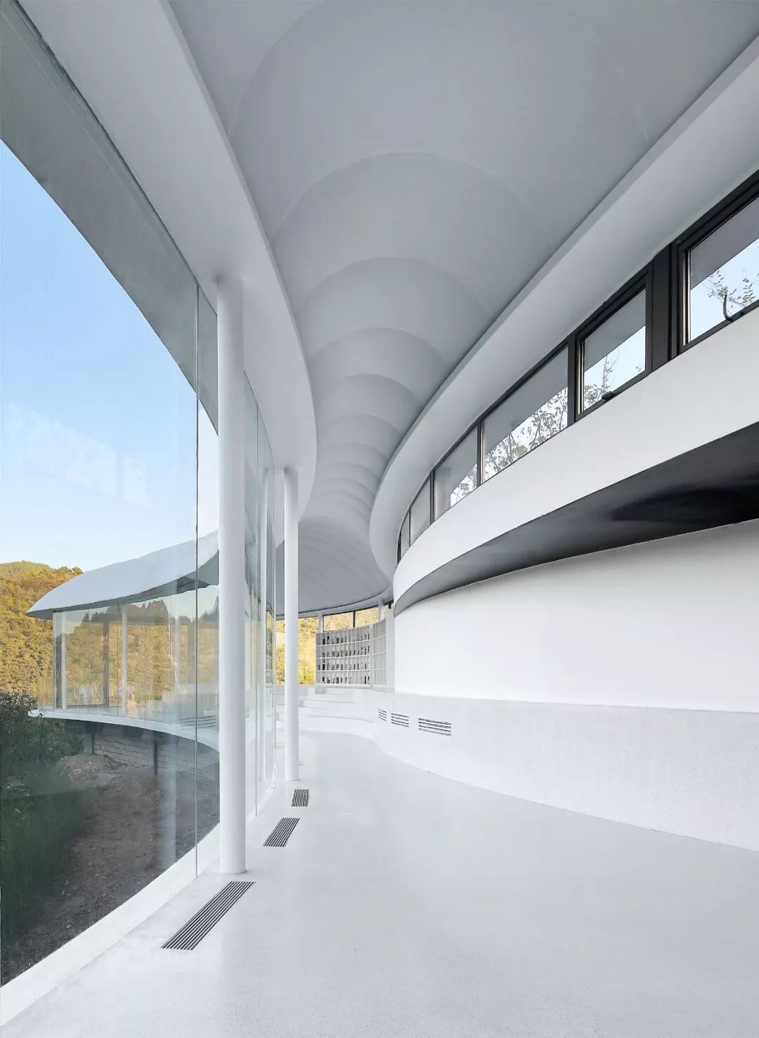 直面峡谷与山峦的北立面则毫无保留地采用了大面积无框玻璃窗,通透的大面玻璃收纳了外部流动的风景,同时消隐屋面以下的实体结构,从远处看,“云”已经浮在山石之上了。