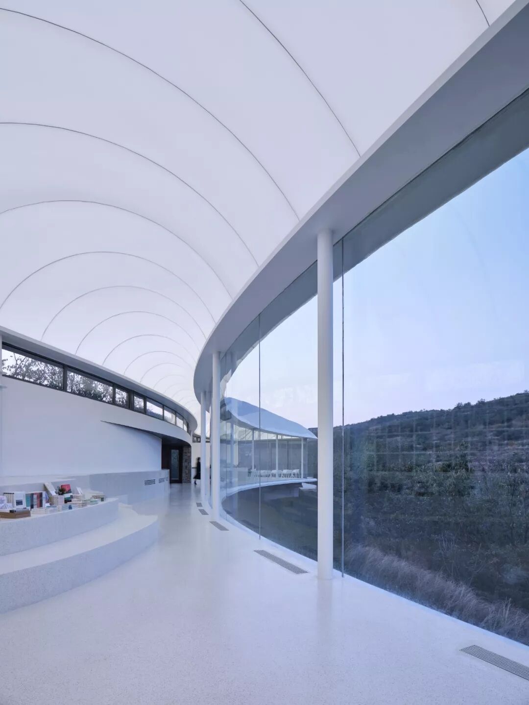 室内同样以一体化的弧面造型的书架和座椅层层叠退。