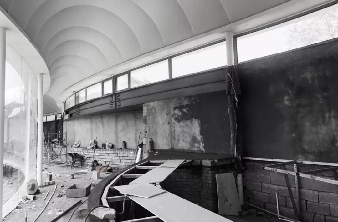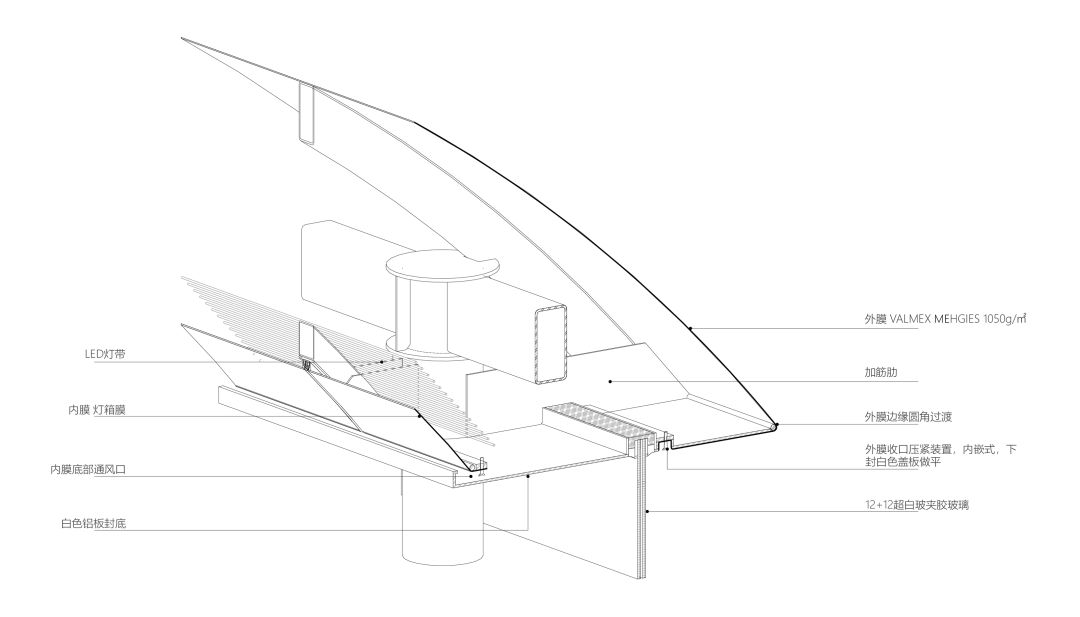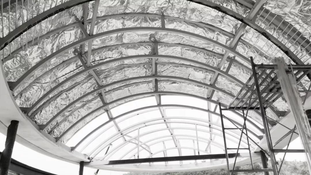 工厂预制化单元构件保证了施工的精确度。直径150mm的细钢柱支撑弧形圈梁,圈梁上搭建双层28对拱形龙骨,这一序列尺寸渐变且排列密集的弧形龙骨,为内外双层膜的流畅张拉提供支持。