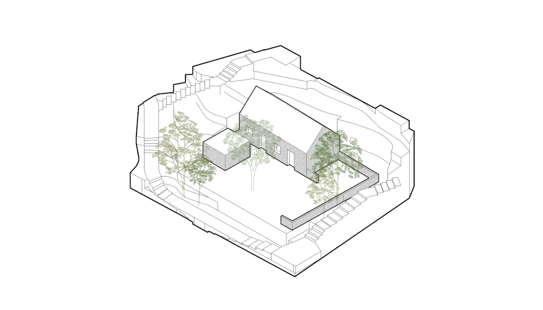 一、二、四号院,场地现存建筑为近期新建的石屋。设计保留了部分毛石墙体,梳理了建筑和场地的关系。一号院有一棵树木,建筑围绕树木形成内庭院。二号院和四号院形成L型的围合院落。