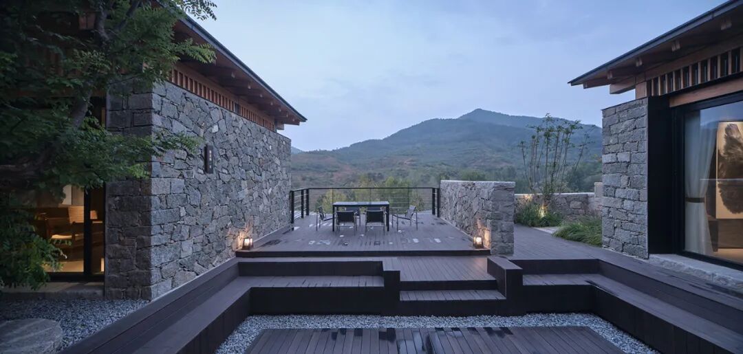 十号院,原为新建的L型布局建筑。设计则顺应原空间格局,采用与五号院相同的L型围合庭院,沿地势创造拾级而上的入口关系,形成高于坡面的室外平台,不受任何视线遮挡,直接与远山对话。![]()
