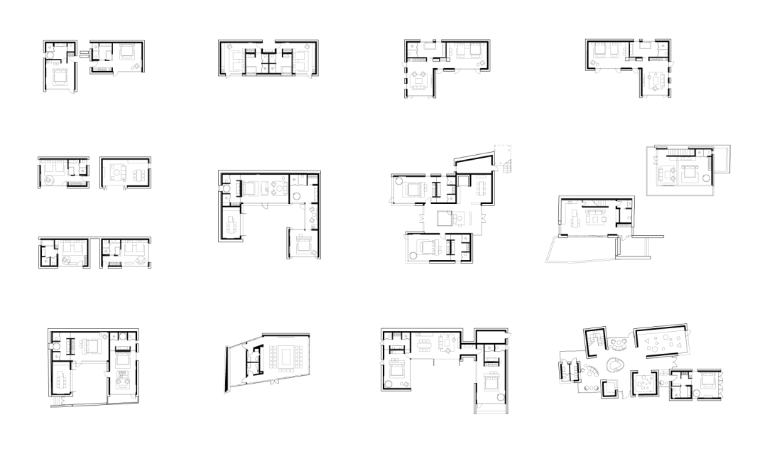 这种框架体系可以根据不同的宅基地,灵活地采用一字型,L型,U型等布局,很好的应对了复杂的宅基地和场地特征。小尺度的框架成了廊,大尺度的框架便成了房间。这种由原型框架生成单体,再生长为整体的方式,与传统聚落的构成方式完全一致。![]()