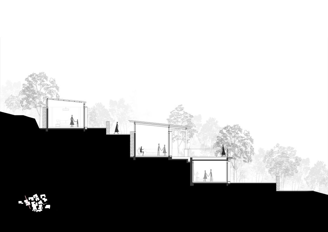 一是“新”功能与“旧”场地。成规模的项目开发,大多会选择将基地上的建筑全部铲除,整体新建,用标准化的客房来取代丰富而有微差的民居,只保留了乡村的外部自然环境。但由于国家宅基地政策,每一幢房子只能限定在现有的宅基地轮廓内,如何在保留原有村落肌理的同时,在内部功能上实现突破,进而满足 “新”的客房需求。二是“新”要求与“旧”施工。作为新建项目,业主及当地居民都对其寄予厚望,城市里那些精美的建筑,成了业主心中的理想目标。然而地理位置偏远,交通不便,现代的大型的施工机械无法展开,施工人员素质普遍不高,在城市中已经普遍使用的建造工艺(幕墙等)很难实现等等,这是很多乡建面临的真实情况。设计如何将这些施工因素考虑在内,保证建筑的完成度和设计品质?三是“新”建筑与“旧”传统。在现代建筑文化的语境下,建筑师面对传统建筑的形式语境,应该如何延续整体风格?建筑师面对新的空间需求与材料条件,又应该如何反映当代?04 设计的回应