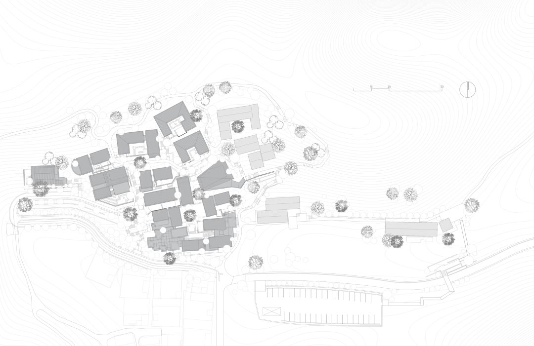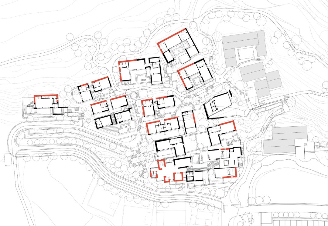面对多重挑战——如何将存量宅基地及集体建设用地有效利用?如何为贫困村引流,产生经济效益,使其可持续发展?我们提出双线并行的设计策略,一是做针灸式的改造,在保持宅基地边界不变的情况下,以存量建筑的空间激活和原有环境的生态修复为切入点,从而实现旧村落的新生,二是通过建立公共空间来激发可以引流的媒体效应。将场地内现有宅基地改造更新为度假酒店,利用少量的集体建设用地指标打造一组具备媒体引流效应的公共建筑,兼顾酒店的公共配套。03 设计的矛盾