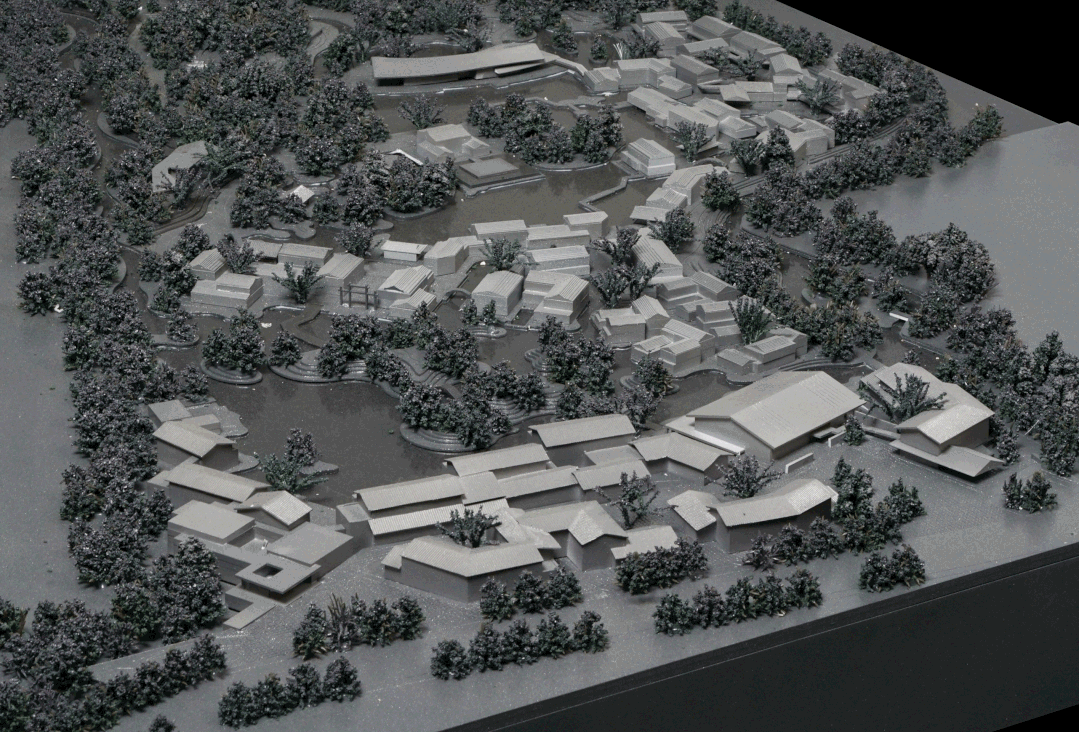 考虑到度假酒店和游客中心在承接景区入口、商业配套等功能时,还肩负一定的城市属性,设计尽可能地使空间开放、可互动性,供周边居民闲余消遣。所以,我们将它的内外两种属性以低矮低密的街巷空间进行表现,其尺度是一种介于传统和现代之间的,既能与老街相呼应,也能一同形成连贯和良好的城市界面,以兼容开放的姿态面向城市,为城市而生。新的街巷,街道宽度与建筑高度比值在1:1-2:1之间,仍能产生内聚、向心的空间,尺度感适中,而不至于离散,易于看清建筑立面与整体关系。新建筑的形式尺度在融合了传统建筑的特征外,适当地进行现代化的抽象演绎,使其更好地服务于新建筑的功能,并能在形态上平衡区域内的意象表达的老建筑与具象表达的新建筑之间的风貌异化。
