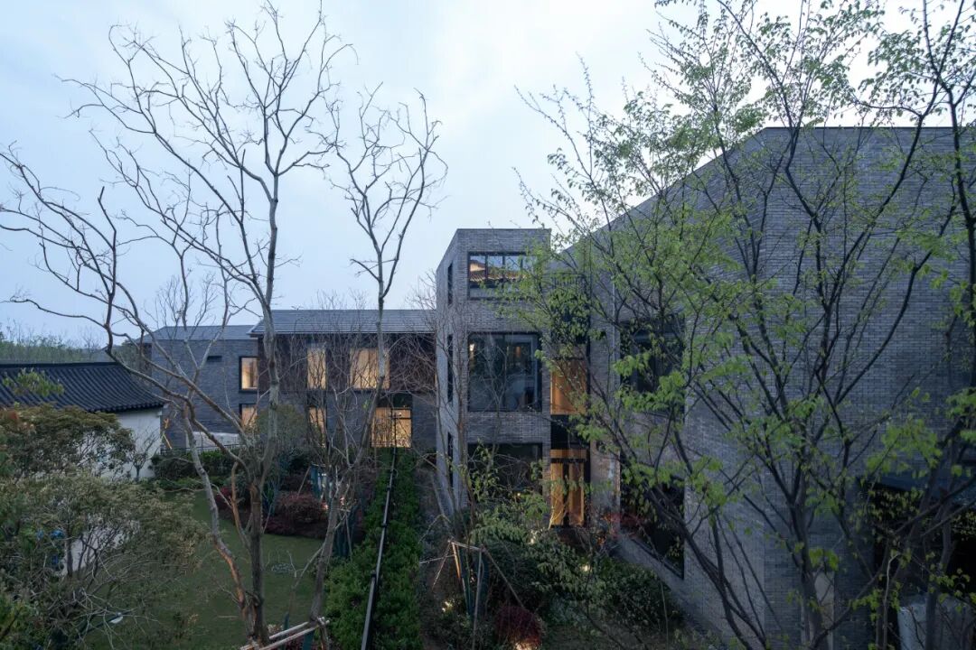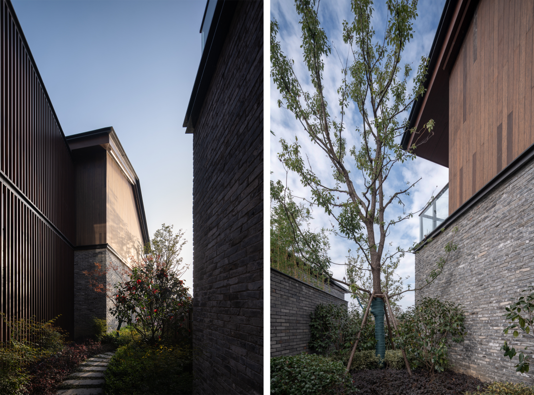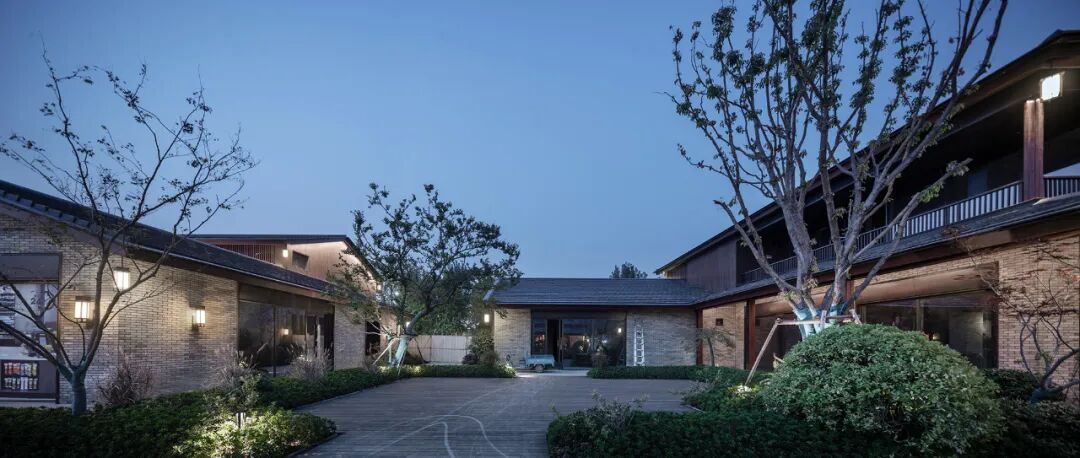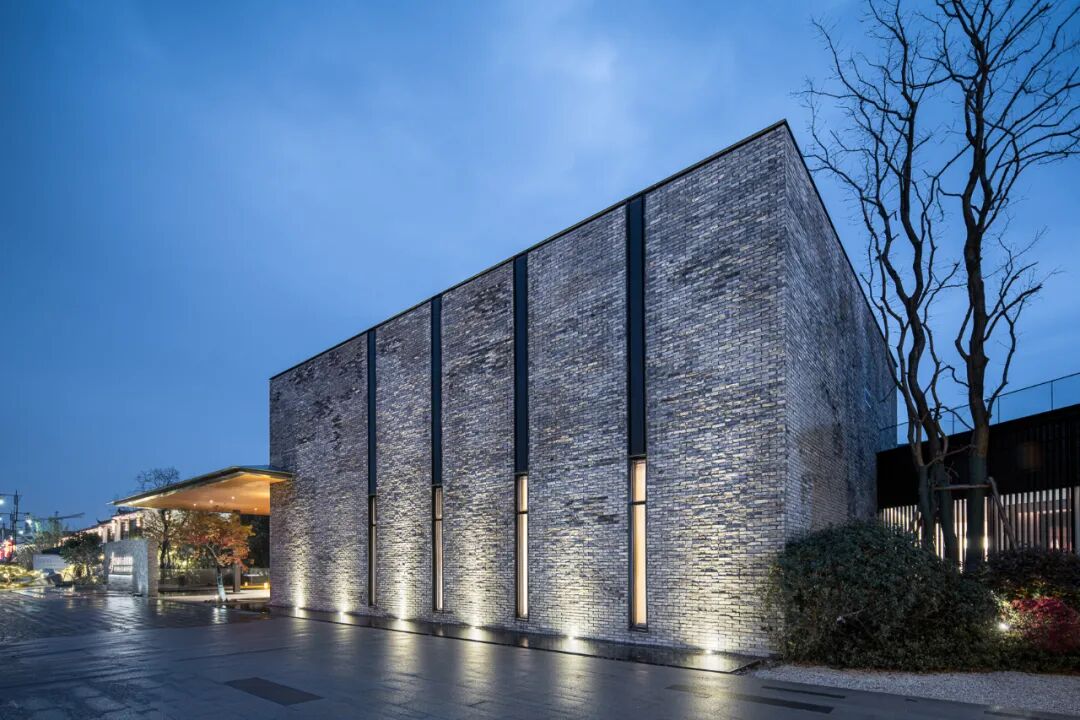 酒店入口处,嵌入灰色砖墙的挑板限定出纯粹利落的指向性空间,抽象的形式语言既能表现古韵味和现代感,也能实现空间的自由度。砌筑墙体的青砖全部由场地而来,再利用的旧砖与玻璃开口结合,形成虚实有致的外立面,在表达厚重的矩形体量的同时,营造出低调稳重的形象。相较于传统的坡屋顶,平屋顶在形式表现和功能尺度上更能满足矩形体量的公区需求。![]()