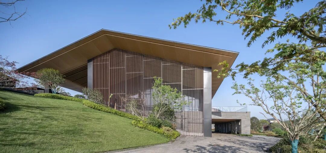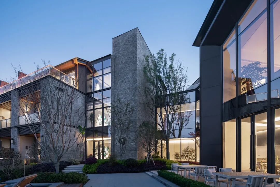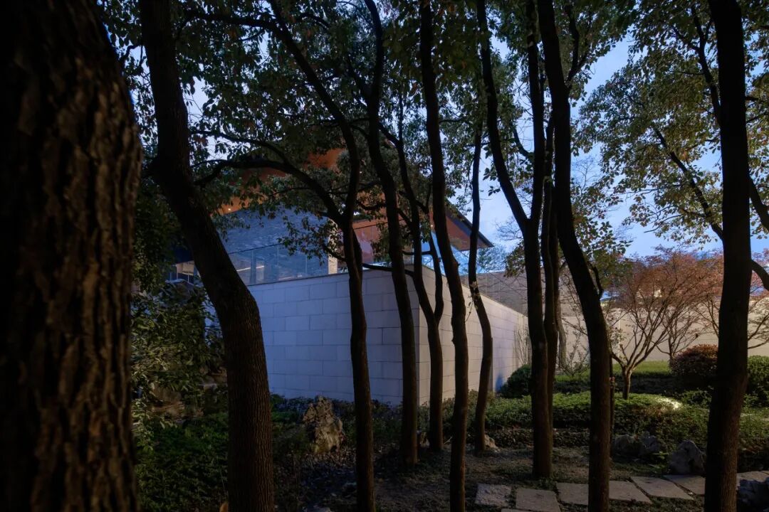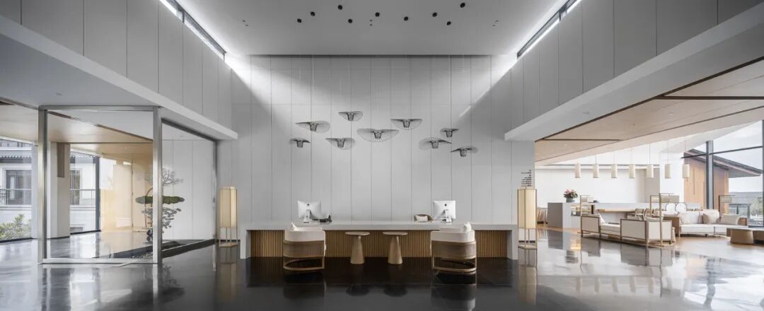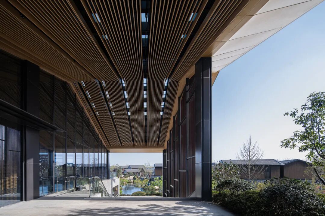 酒店入口处,嵌入灰色砖墙的挑板限定出纯粹利落的指向性空间,抽象的形式语言既能表现古韵味和现代感,也能实现空间的自由度。砌筑墙体的青砖全部由场地而来,再利用的旧砖与玻璃开口结合,形成虚实有致的外立面,在表达厚重的矩形体量的同时,营造出低调稳重的形象。相较于传统的坡屋顶,平屋顶在形式表现和功能尺度上更能满足矩形体量的公区需求。![]()