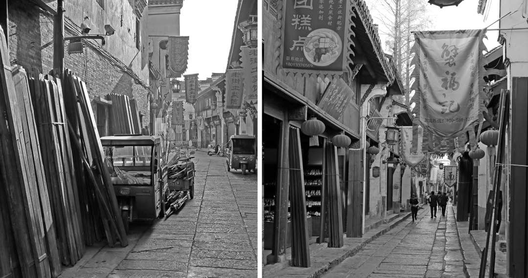 现代界面影响主要是老街周边扩建的商业街区,包括徽式仿古民居和仿民国风格的砖砌建筑。新建筑多为2-3层,空间层次丰富、开放,建筑尺度相较传统民居要大一些。场地东侧紧邻新的社区组团,是常见的南北向行列式肌理,而社区配套的商业街区以黑瓦白墙的新中式建筑为主。