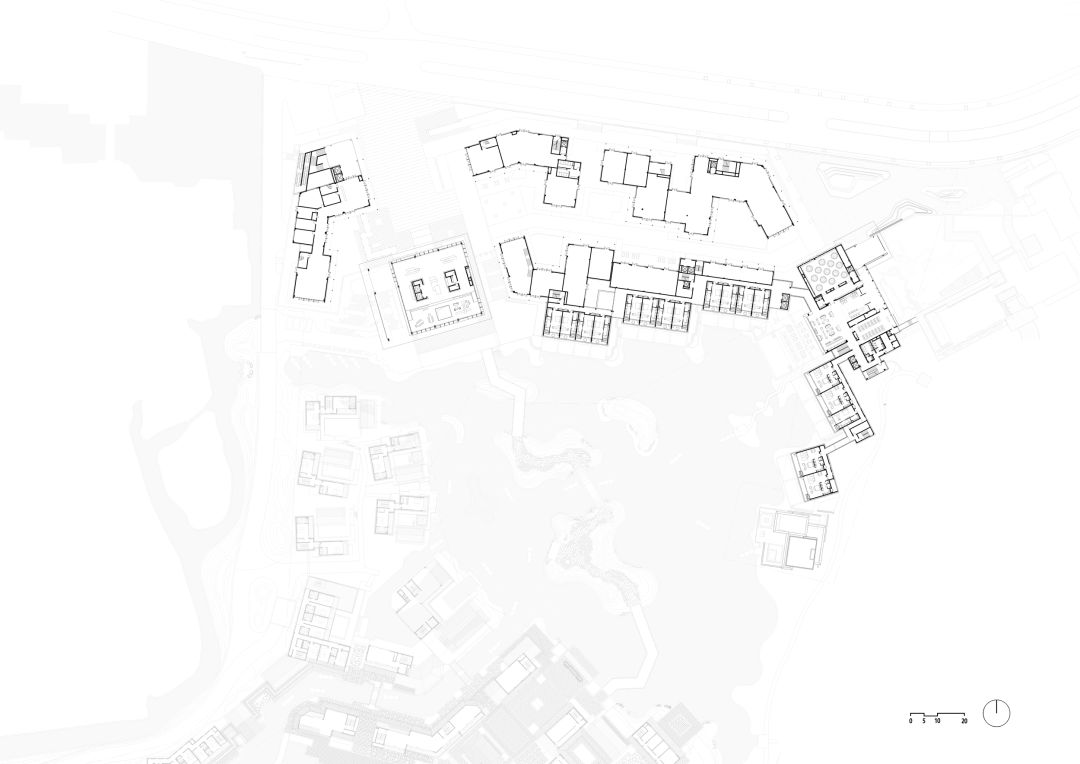酒店入口隐于街巷东侧,以“亭”对空间进行起承转合。这样的布局方式一来保证酒店独有的沉浸式度假环境,尽可能减少来自外界的干扰,二来将水系外围最优的自然景观全部交由客房区。酒店共包含55间客房、3个特色餐厅、3个会议室、2个健身房,同时配备酒吧、书吧、儿童活动室等设施。依据功能将体块分为公共区、客房区、后勤区。公共区在功能需求上尺度更大,以矩形体量的形式退后排布;客房区保持与民居聚落相近的比例和尺度,以低矮的单体为主,沿“水”线性排布。竖向来看,设计巧妙地利用地形差,将首层餐厅下沉形成庭院,二层酒店大堂与主入口相连。下沉庭院中适当填充亭台、山石等江南园林的景观意象,为餐厅提供必要的采光通风和景观环境。大堂是酒店的重要节点,位于景观主轴中心位,稍抬高的地形差使得景观视野变得更开阔,自然地构成了“大堂—景观面—视觉焦点(湖面拱桥水榭)”的景观轴线。横向来看,客房单体一定程度地错开布置,由玻璃廊桥连接,目的是为所有客房争取景观面,而且保证通达性和私密性。![]()