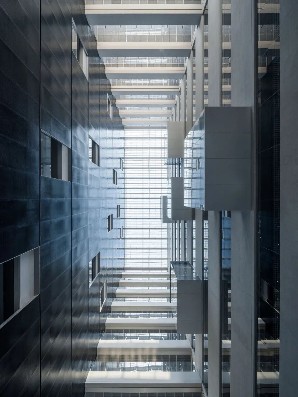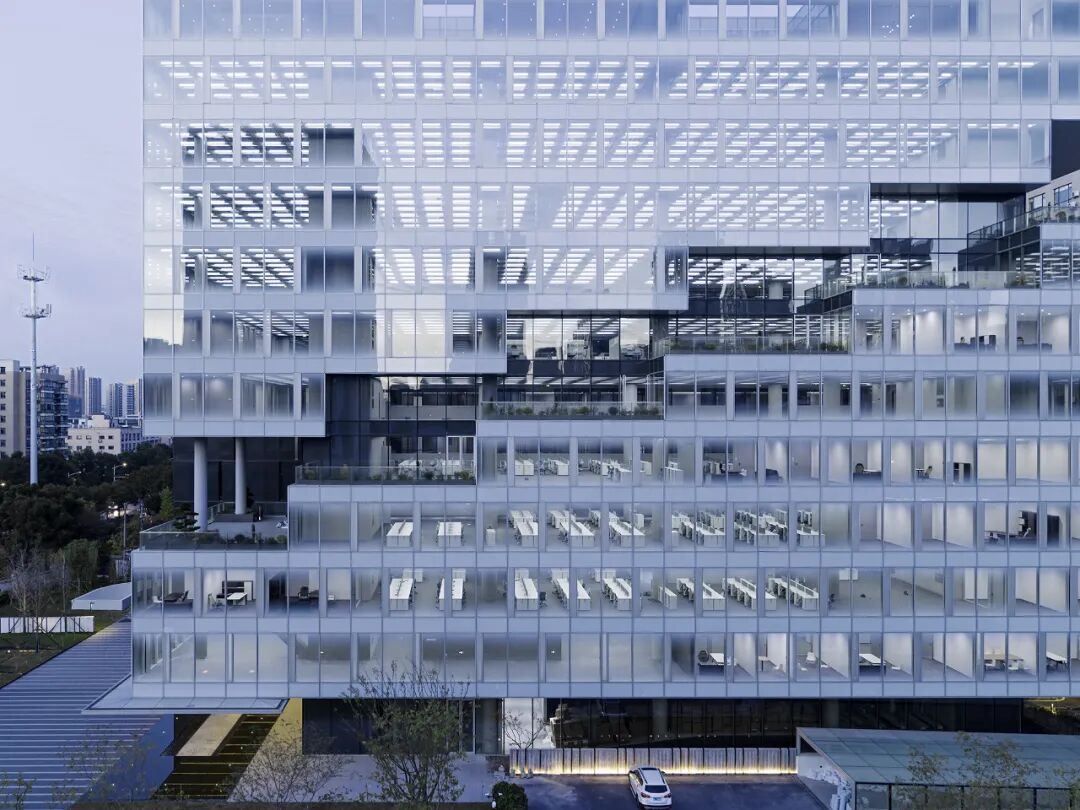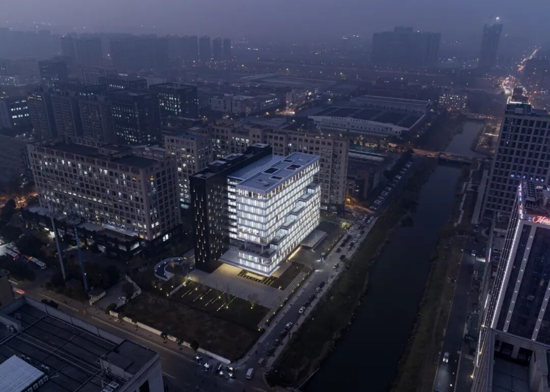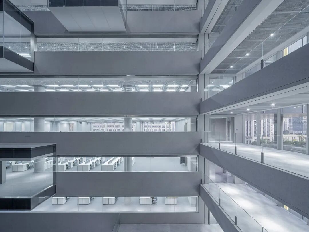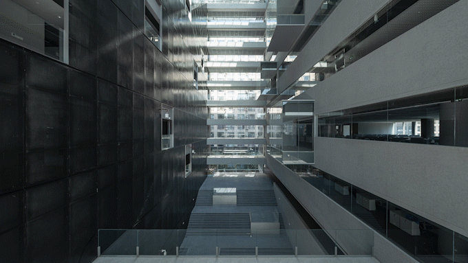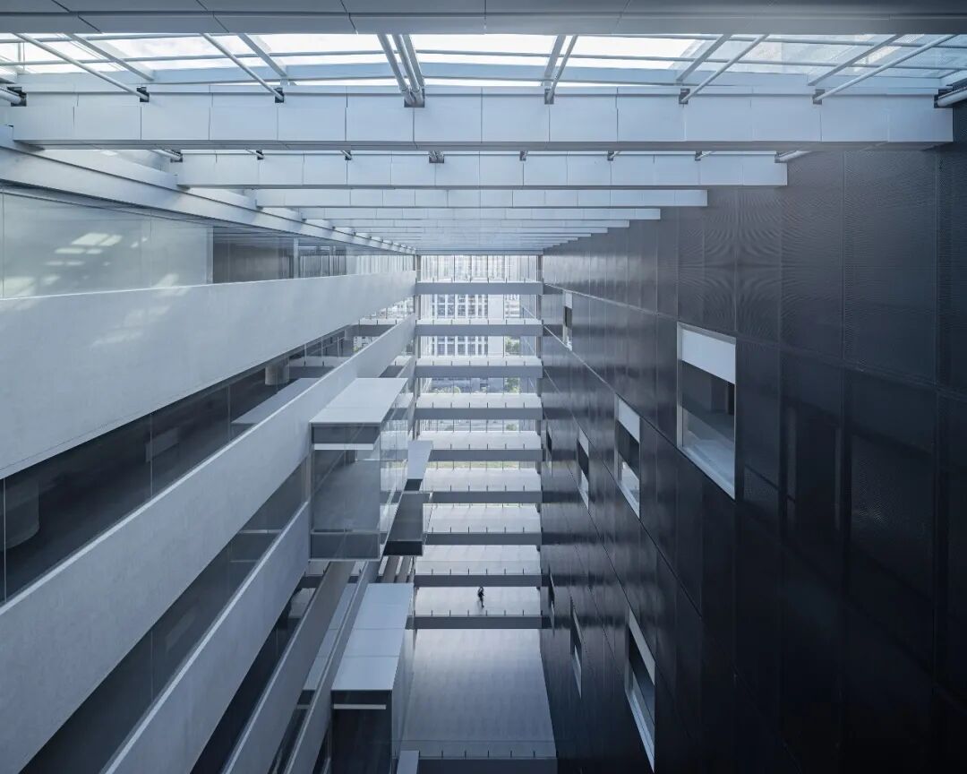 办公空间和辅助功能分离的策略在建筑形式上外化为两个独立的体块。对于由两个体块分离所形成的中庭,我们并非常规地以其自身的中心性为设计出发点,而是将体块形成的虚实关系在中庭内如实呈现。