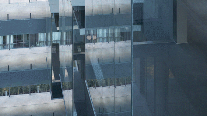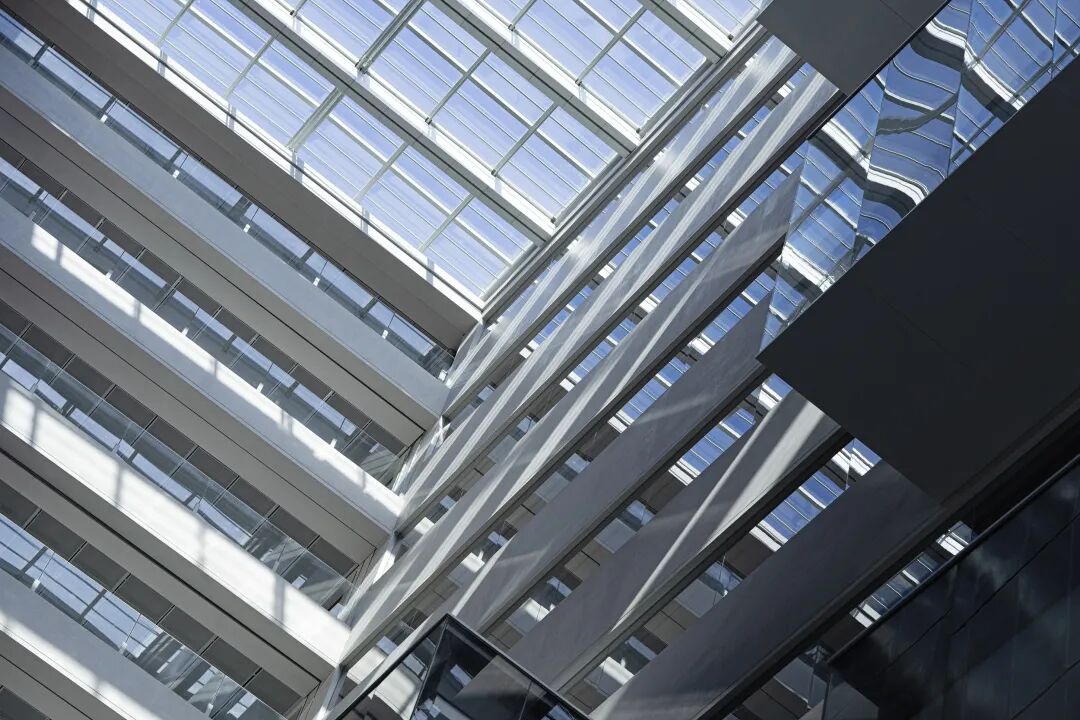连廊作为连接黑白两个体块的纽带位于中庭的南北两侧,这是员工在日常工作中穿梭频率最高的交通空间。浅色的PVC地面结合两侧通透的界面,让行人可以在穿行时浸润在中庭阳光和外部景观中。透过灵透的玻璃,借景远观,驻足停留,感中庭之阔。此时建筑中的人亦是建筑外之景:你站在桥上看风景,看风景的人在楼上看你。