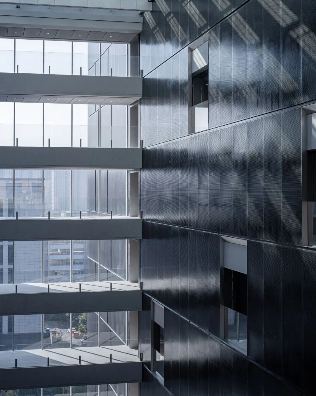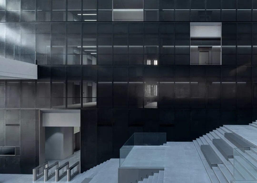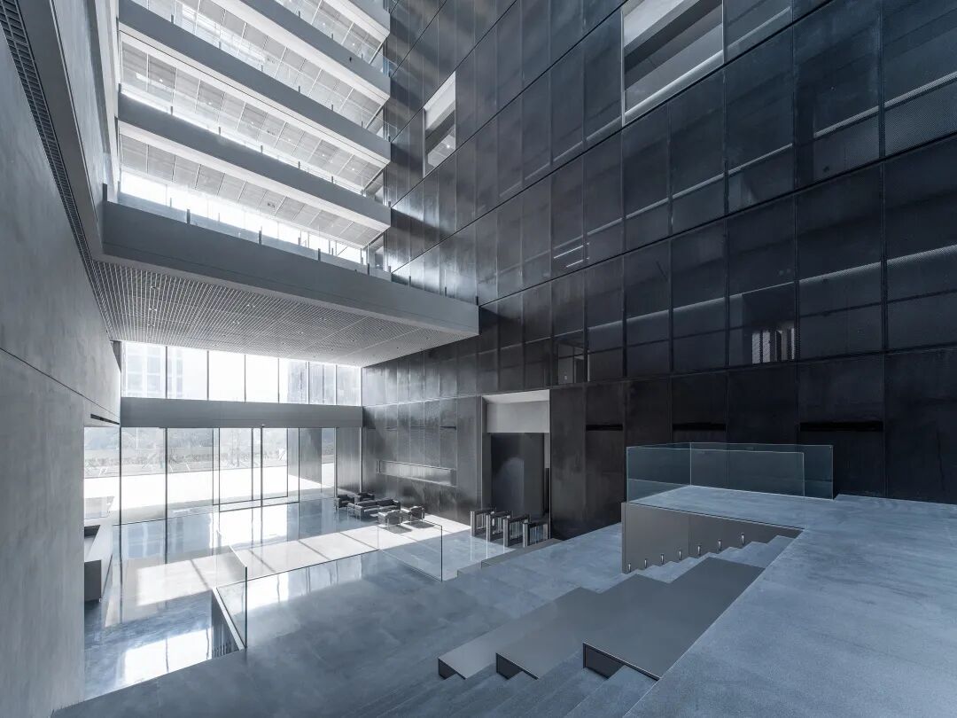 中庭西侧直接采用辅助功能体块的外立面材料,深色穿孔板由幕墙单位统一深化落地,最大程度突出该功能块的体量感和整体性。