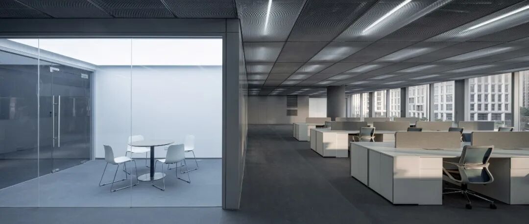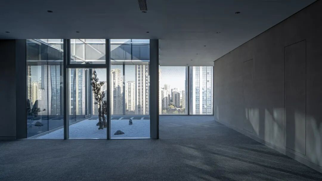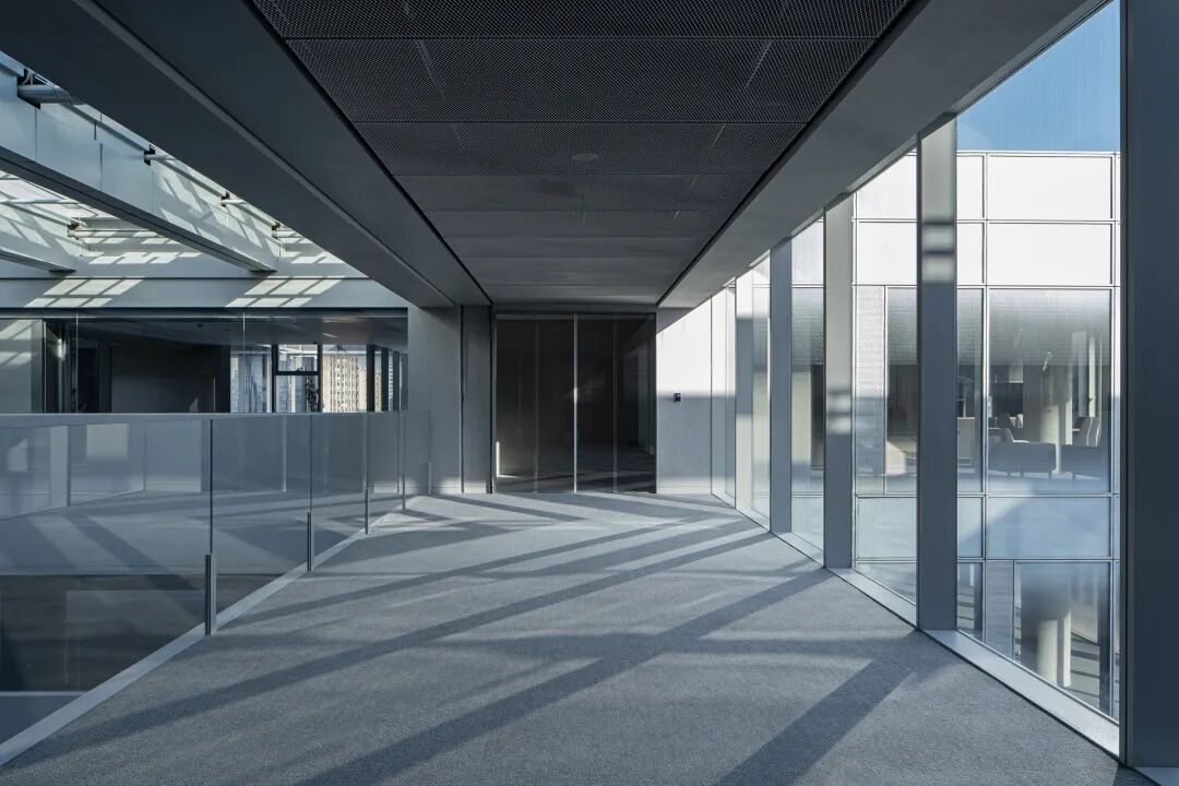 位于顶楼的高管层廊道引入户外庭院,微景小庭既是走廊的一道风景,亦是管理者独立办公室的小型后花园。以小景联结远景,值此着眼伏案之事时,也足以心怀繁华旖旎。建筑室内外景观在此融合,内外在此产生互动。