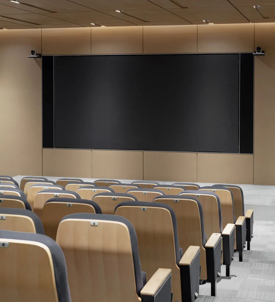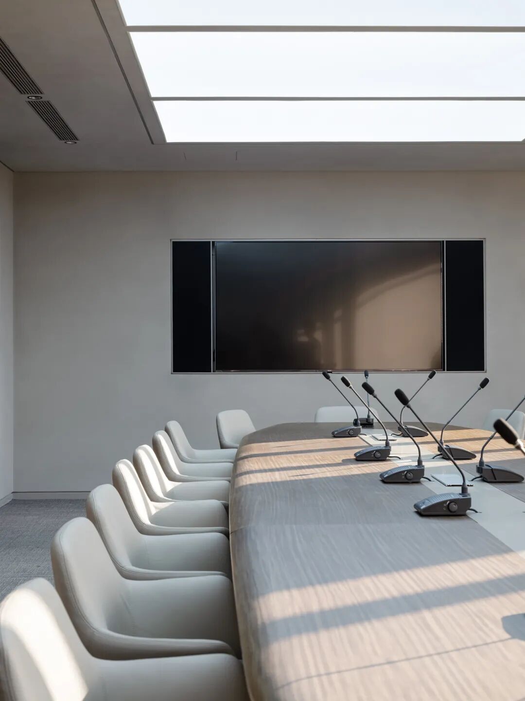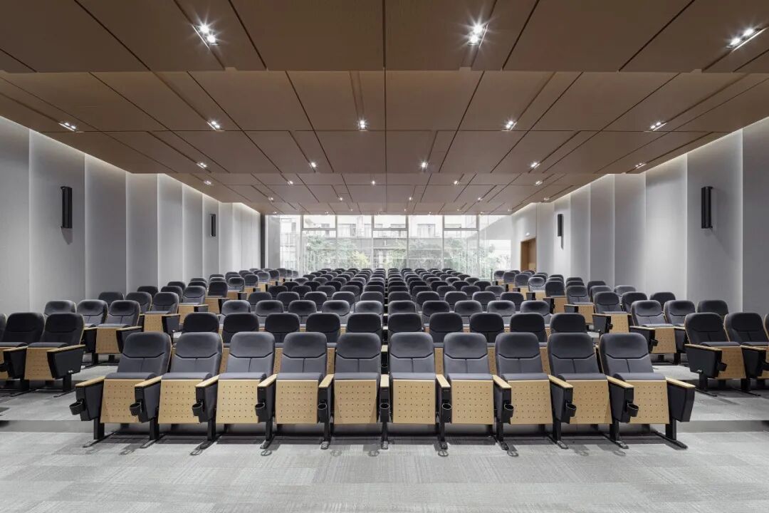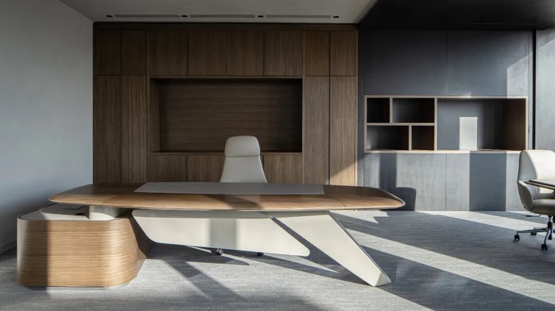 区别于素净的办公空间,管理人员的独立办公室、会议室以及报告厅引入温润的胡桃木与深色木饰面,以雅致的空间氛围延续整体空间的简约风格,拉近与会者的心理沟通距离。
