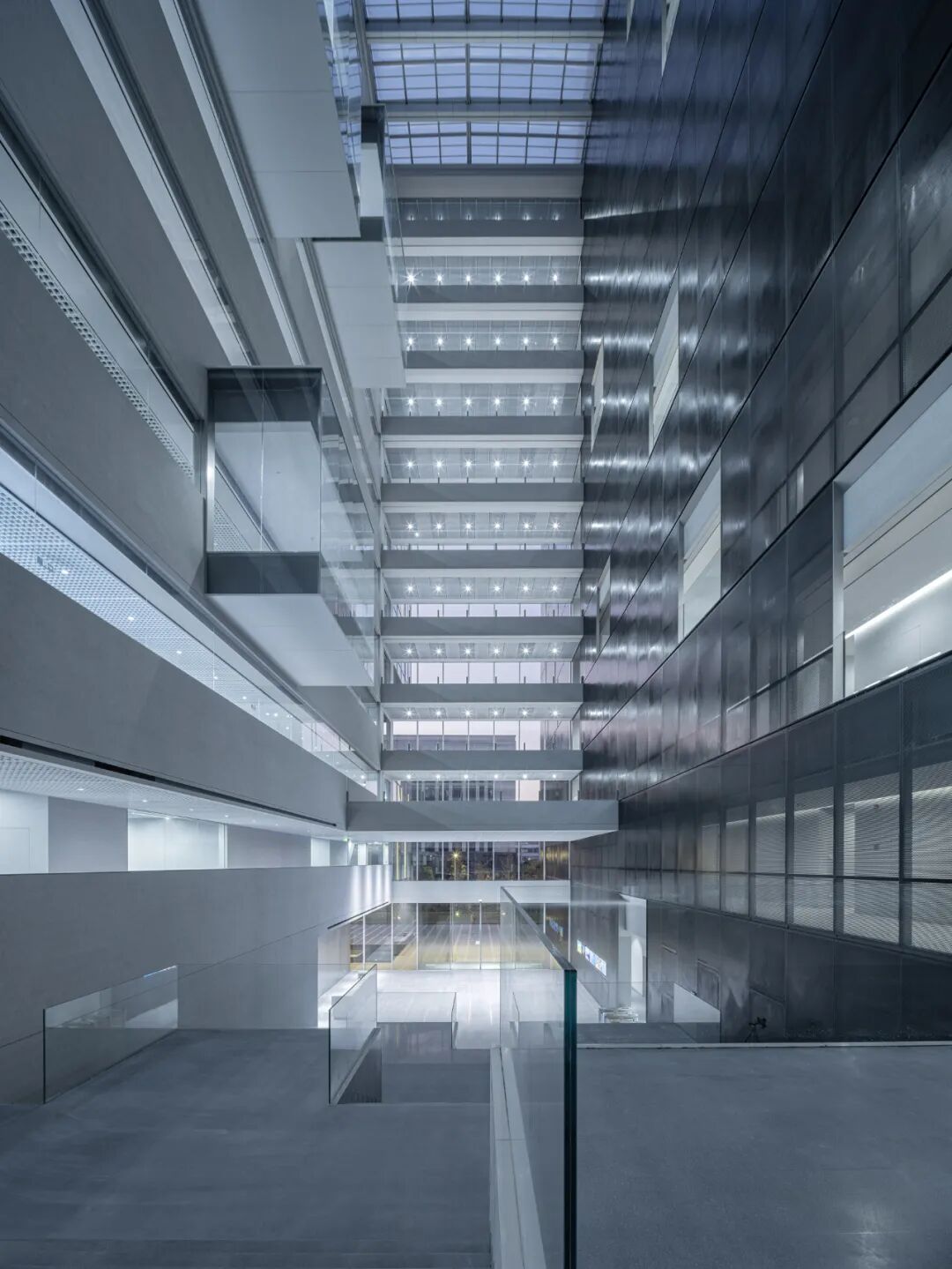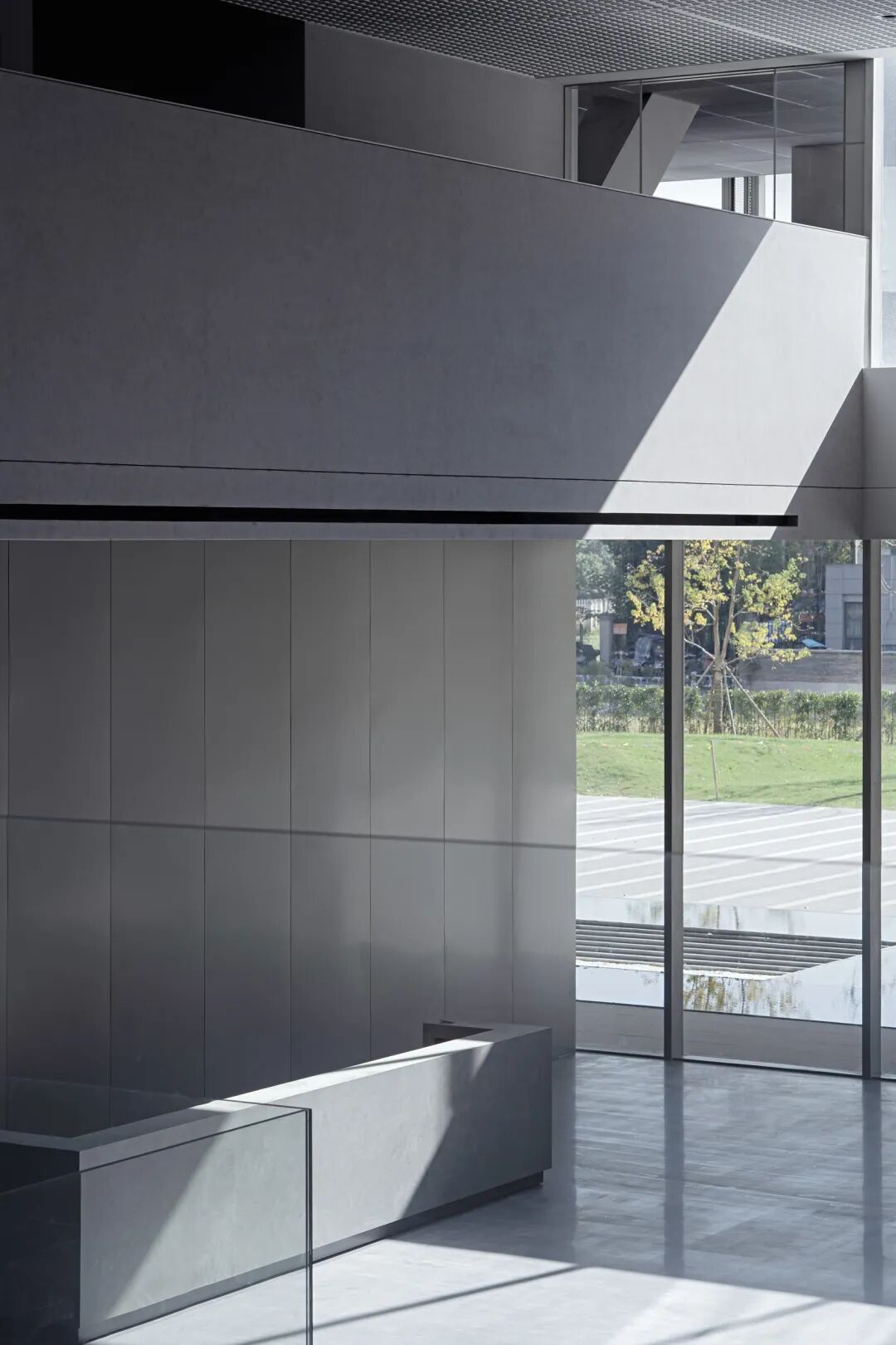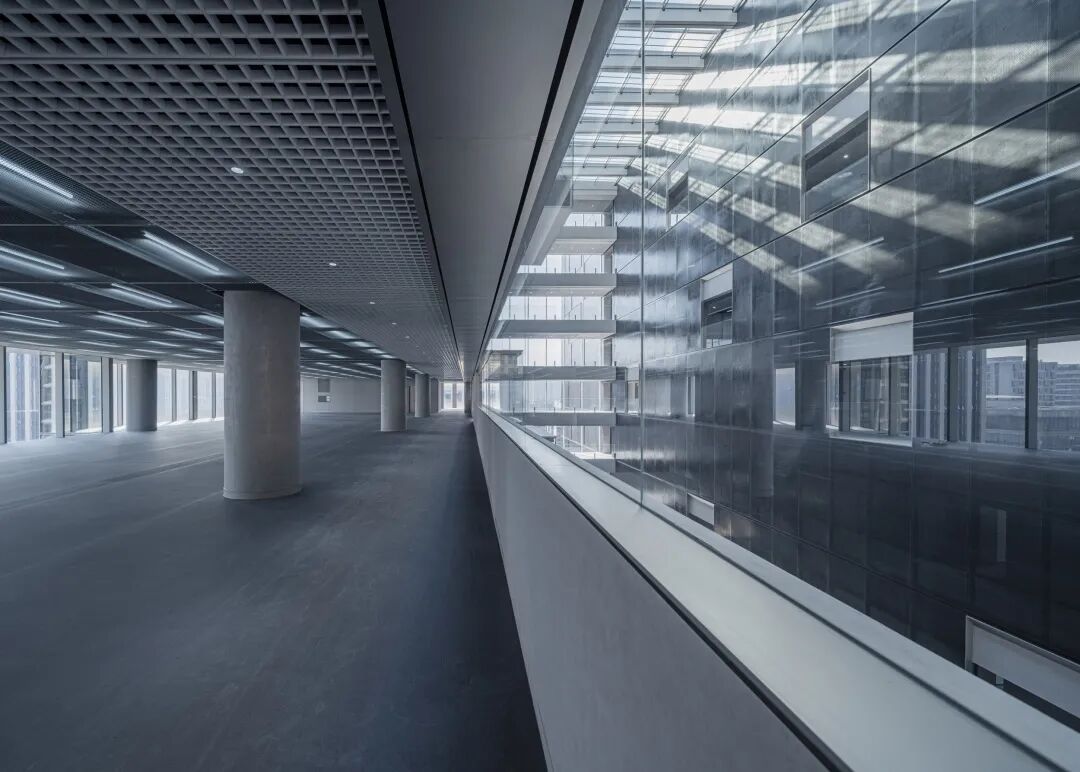 东侧水平向的连续超白玻沿用了外立面的单元式幕墙,加强了办公空间与中庭的联系,实体部分采用混凝土漆面,保有空间的简洁性。内外材质延续性,虚实材质的对比,同时强调出办公空间侧的秩序感。