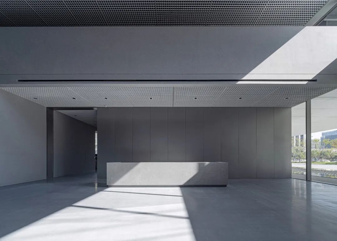 当你由主入口步入门厅,左右两侧中庭界面在深浅的对比中静谧流淌,在一明一暗间,接待、前台、展示依次徐徐展开。