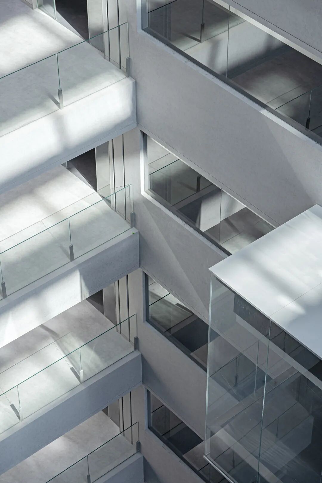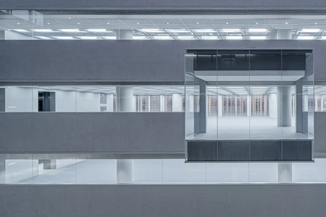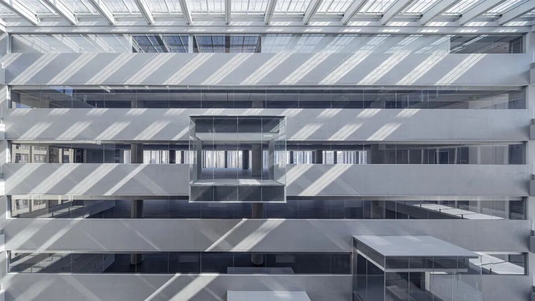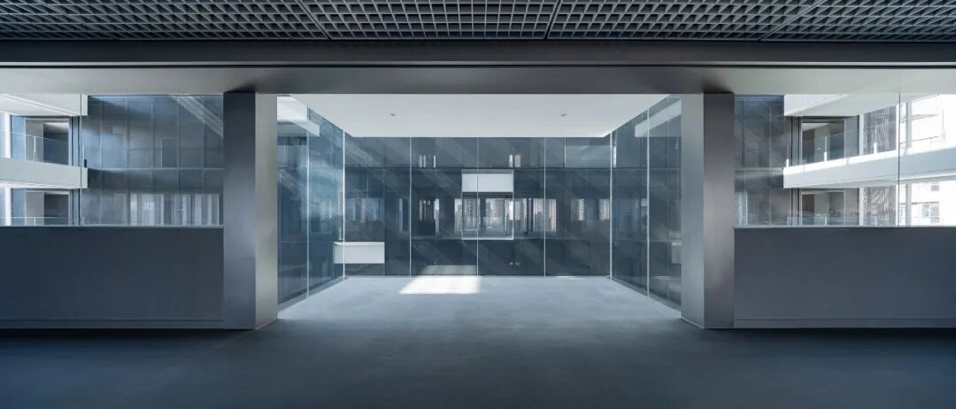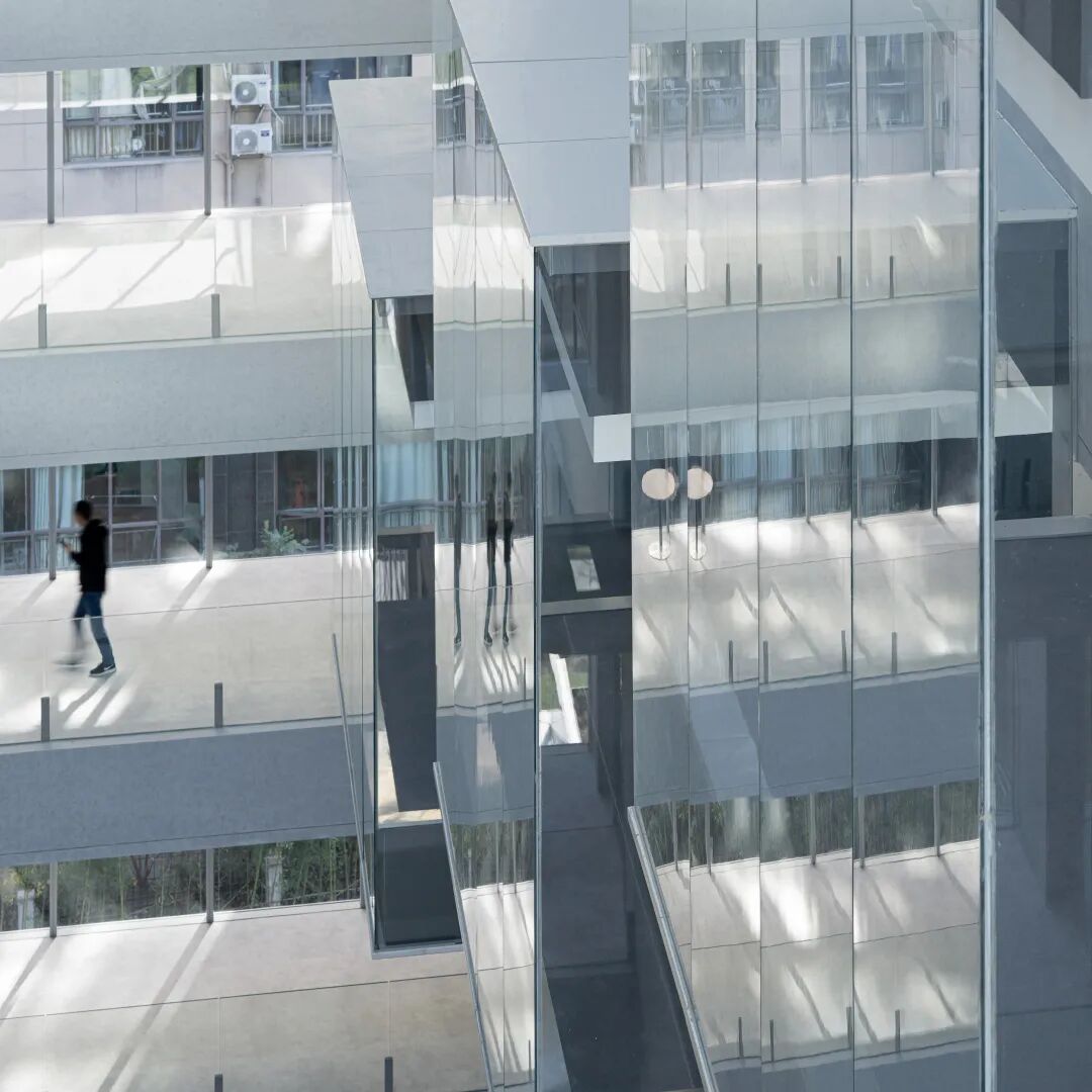 东侧的玻璃小盒子,在纵向上延续着台阶体块的错落感,在横向上将办公空间向中庭延伸,为员工营造了一个视野相对开阔的交流小空间,也让不期而遇的惬意交流得以在此发生。玻璃小盒子同样采用了透亮的超白玻璃与混凝土漆面,与办公侧的虚实秩序相衔接。