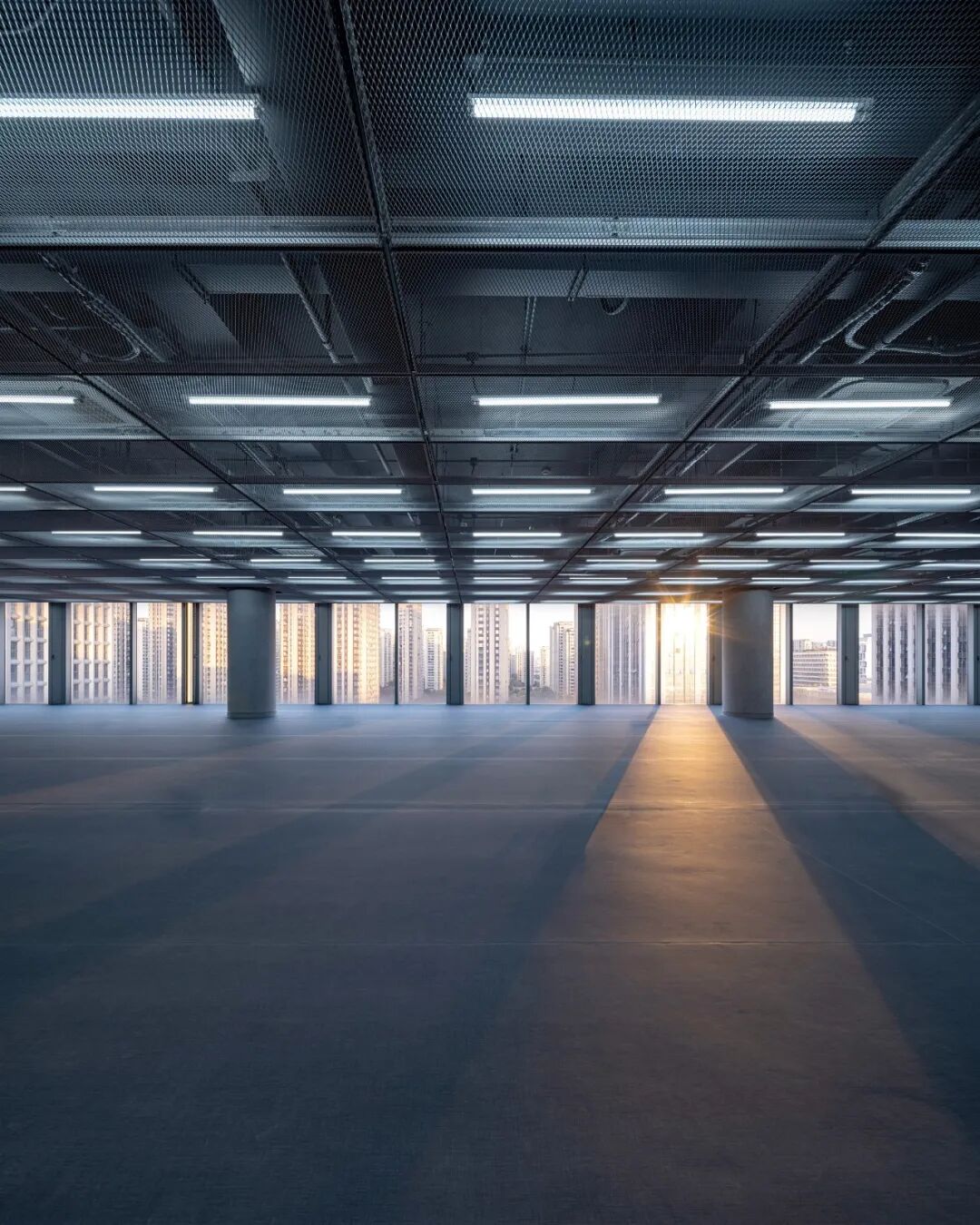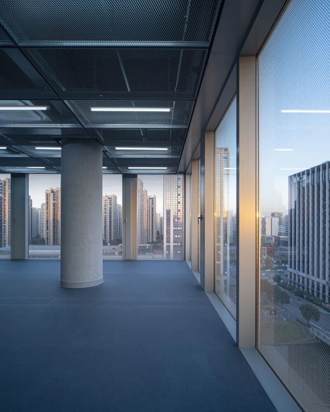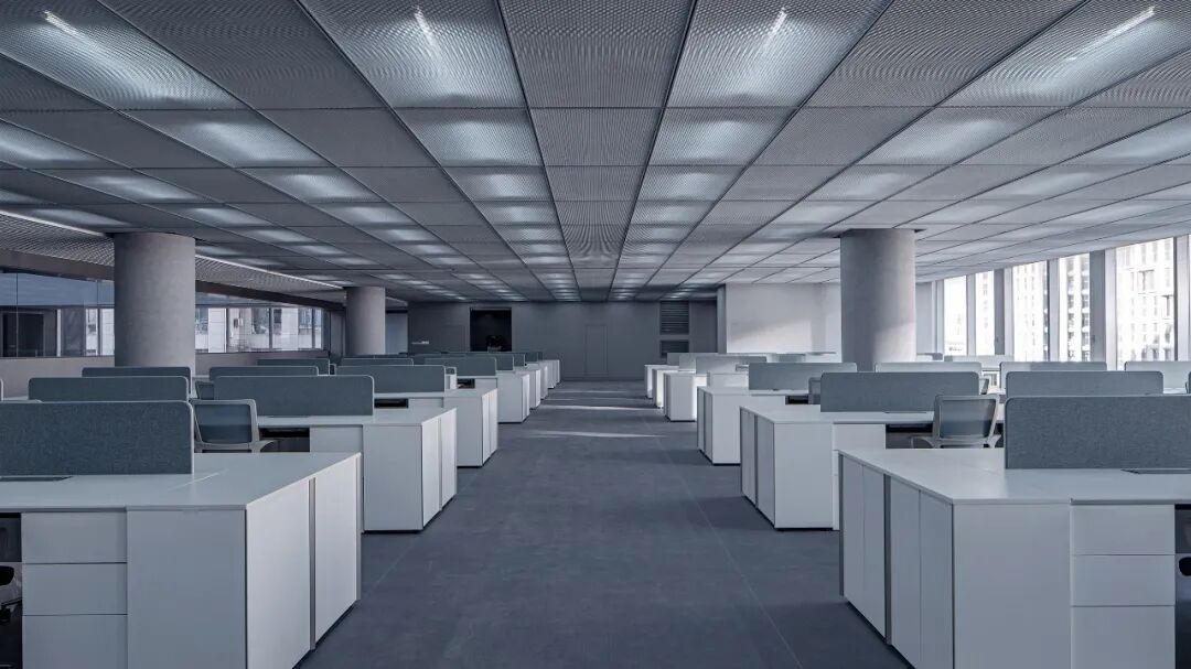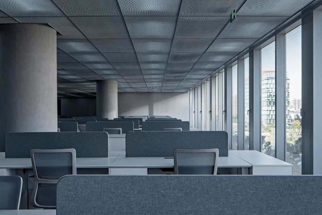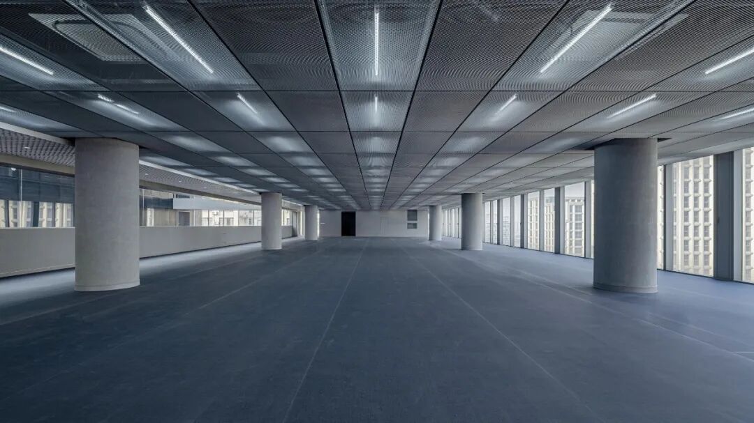 模数的应用是设计最终品质的保证。我们将单元式幕墙的水平向距离作为标准办公层内部空间的基本模数:天花板金属拉伸网板的板幅及独立办公的开间划分皆以此为准则。既保证内外空间品质,也利于在后期使用中调整。