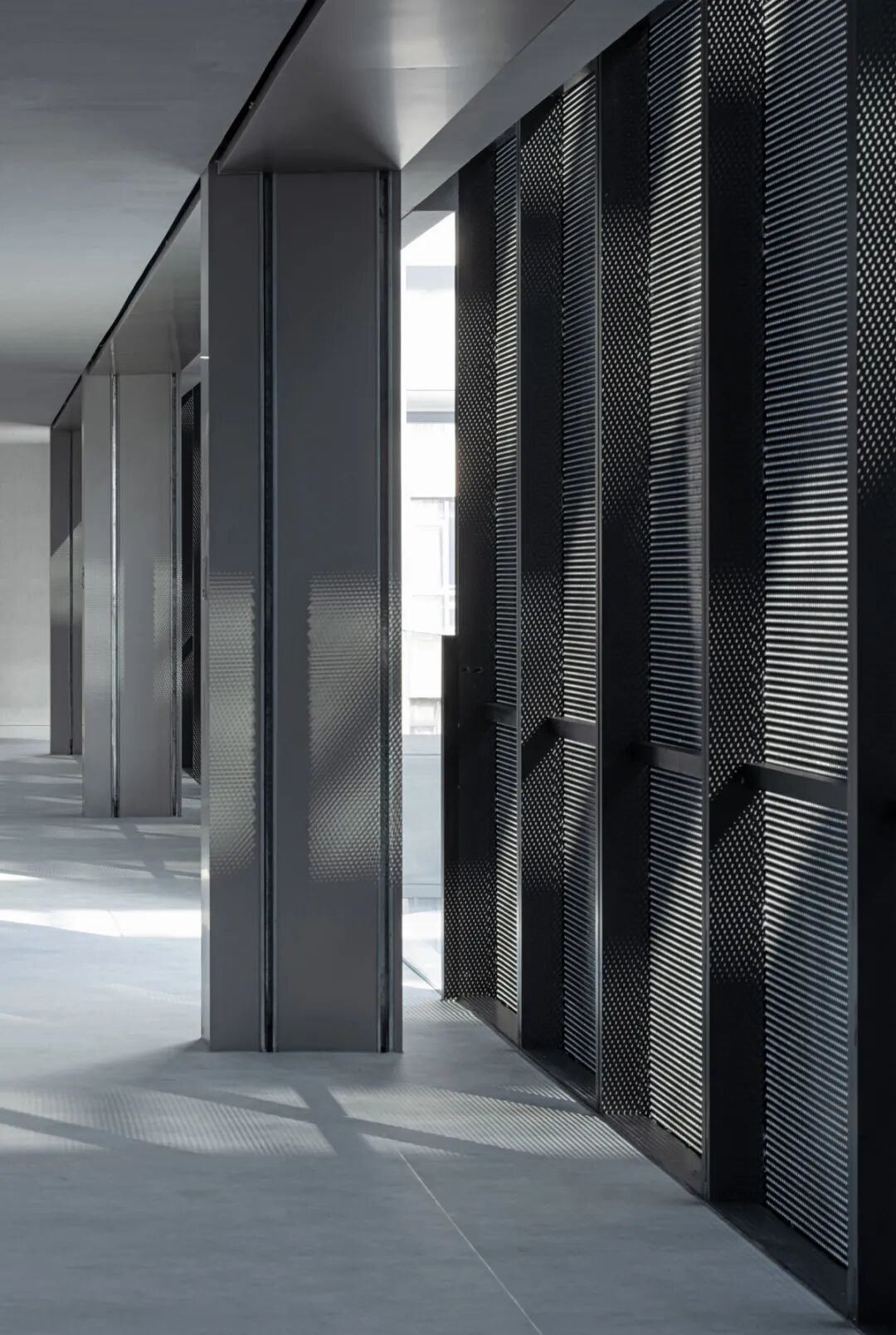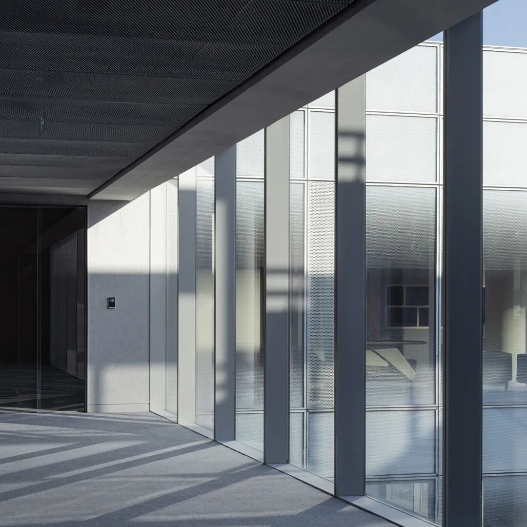 我们用最原始的光影来装饰西侧辅助空间内的走道,光影源于建筑本身,无需刻意塑造。中庭的阳光透过西侧的黑色金属面,将单元式幕墙的序列感由立面转译至地面。穿孔铝板的细节则装饰了墙面和地面的斑驳表情。