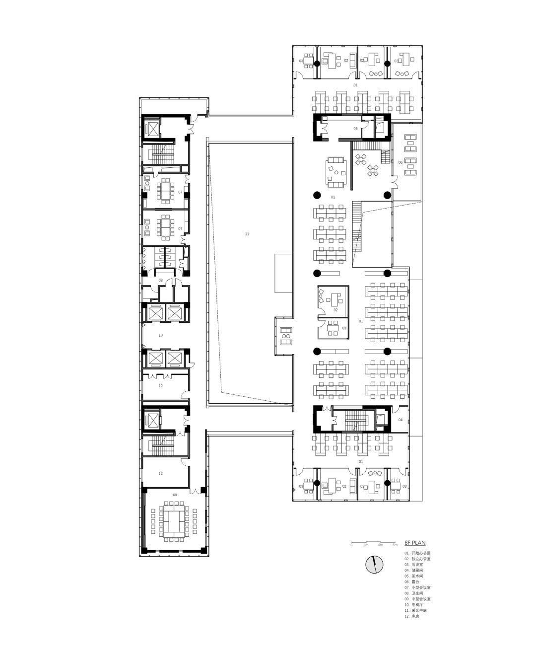 办公空间3至11层都采用“大比例开敞办公”与“小比例独立办公”的模式。我们将独立办公及会议室设置在南北两端,保证中部开敞区域的完整性,以适应未来灵活多变的需求。