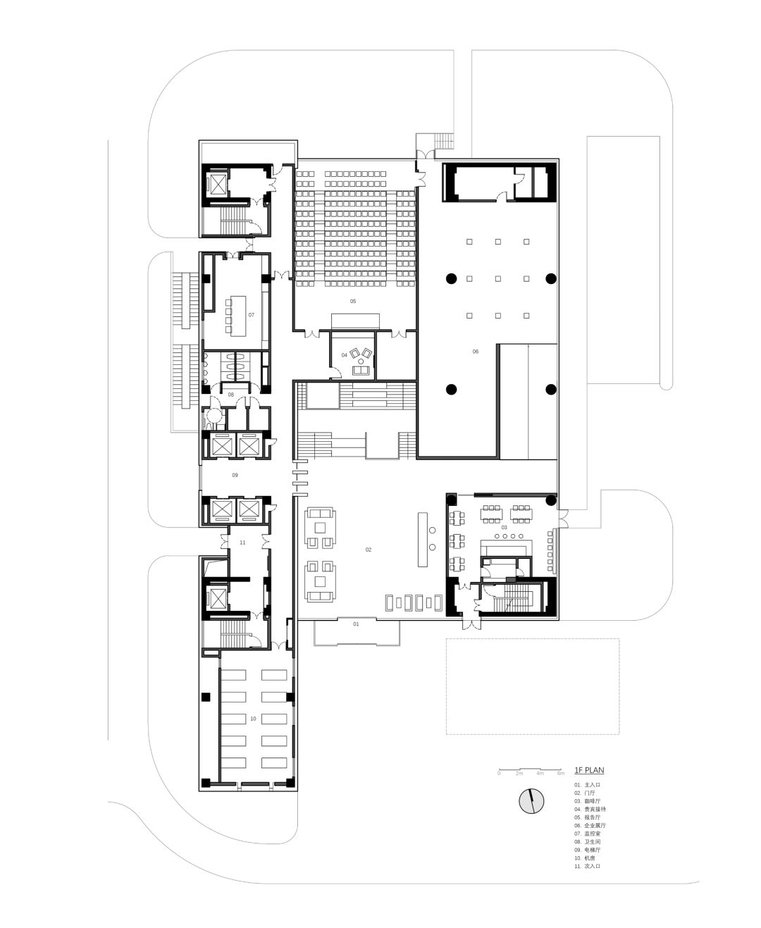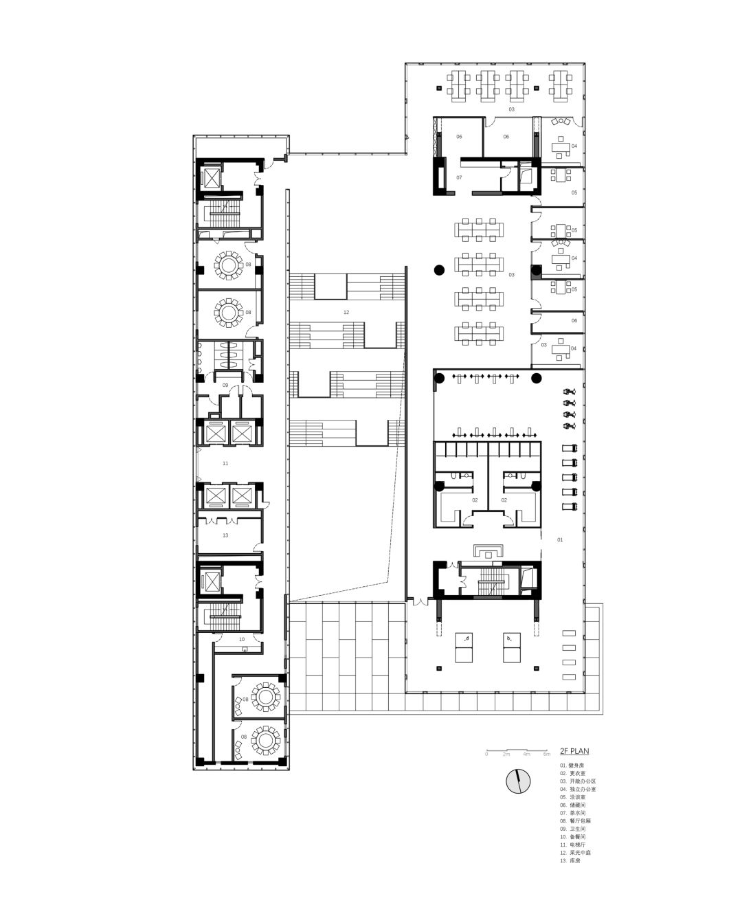 在此混合的组织内,为规避未来需求变更致使空间反复调整而带来的不便,我们将辅助功能剥离至西侧体量,形成连续一体不加分隔的大办公区来应对未来划分的不确定性。我们不定义空间,由使用者定义。