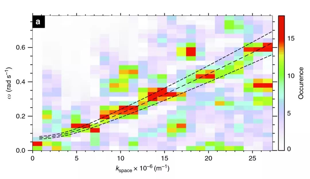 图2 观测得到的极光色散关系和理论计算的阿尔芬波色散关系对比(Kalmoni et al., 2018)。其中颜色区域代表在该波数对应频率的发生率,三条虚线分别代表理论计算的磁尾赤道面区域平行波长为1.8RE,1.8RE±10%的阿尔芬波色散关系曲线