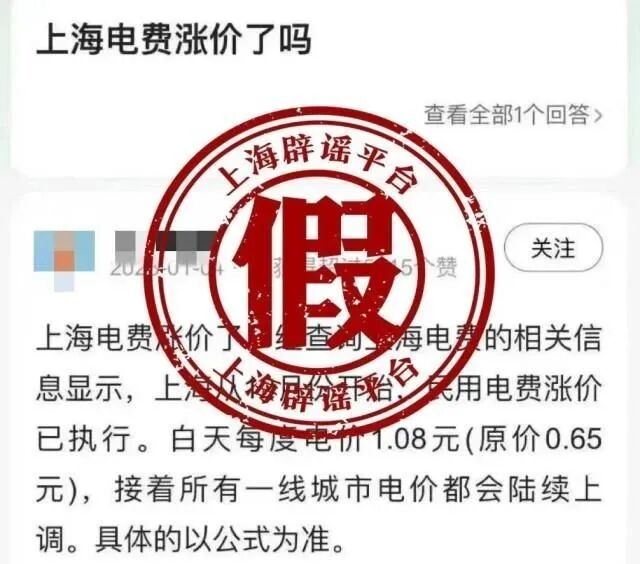 据“上海网络辟谣”消息,近日,一张“上海电费涨价了吗”的截屏在互联网平台传播。发帖者言之凿凿,称“上海电费涨价了”,还表示涨价从去年12月已开始。