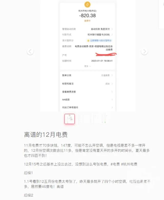 有上海网友晒出的电费账单显示,12月的电费超过了1000元。有杭州网友晒出了自家12月的电费账单:820元,而“11月电费才70多块钱。”