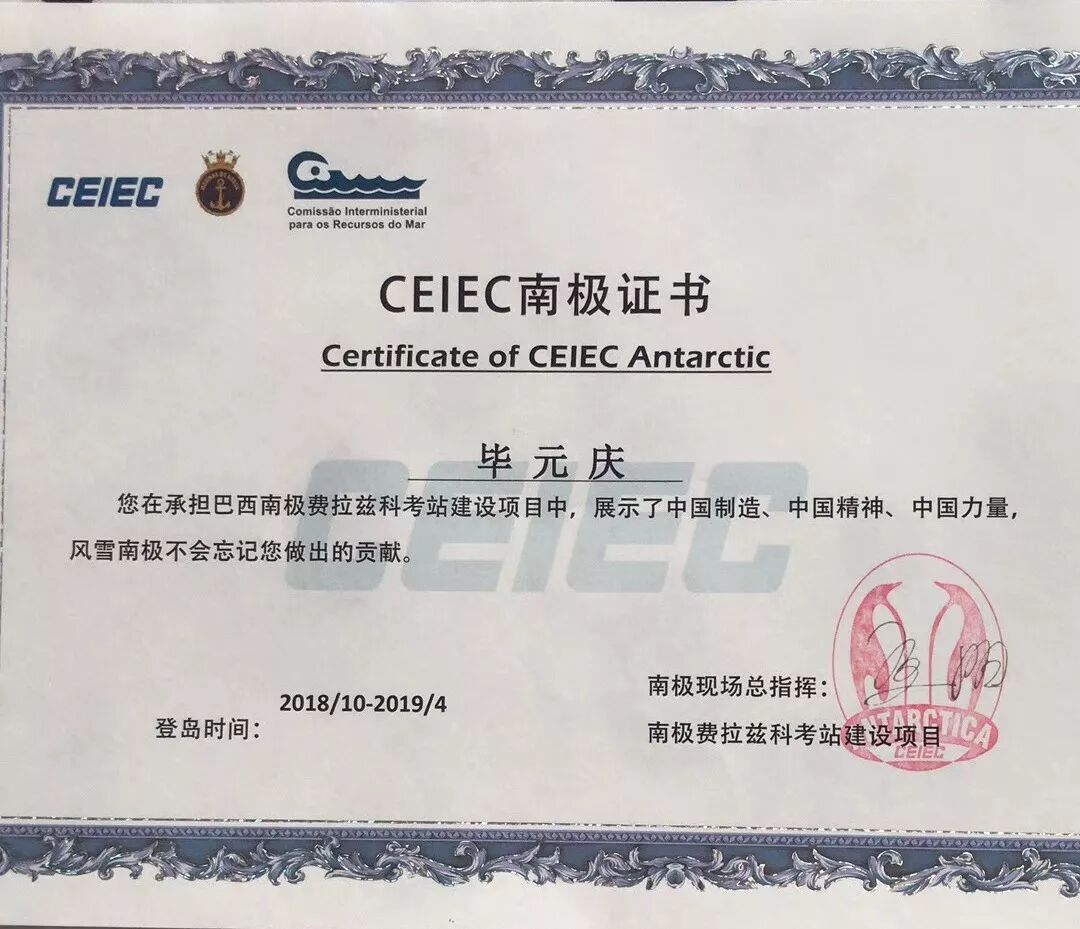 今年4月份,毕元庆收到了南极费拉兹科考站项目的一张“南极证书”。