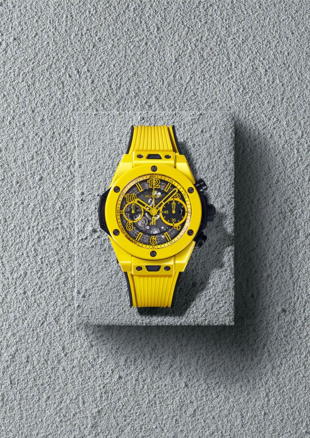 在红色、蓝色、米色和绿色陶瓷的基础上,黄色陶瓷被研发出来。限量发售 250 枚的 HUBLOT 宇舶表 BIG BANG UNICO 黄色魔力腕表,42 毫米表壳和表圈满溢阳光活力,在黄色陶瓷的映衬下熠熠生辉。从外缘、时标、分钟和秒钟计时盘,到阿拉伯数字和指针,这些细节均采用了黄色,让腕表充满活力。透过蓝宝石镜面,UNICO HUB1280 表厂自制机芯以及导柱轮的机械之美一览无遗。
