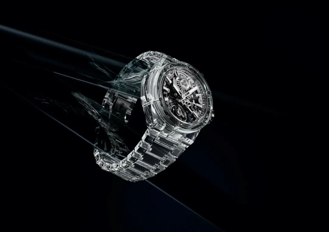 今年,宇舶表推出了 Big Bang Integral 一体式陀飞轮全透明蓝宝石腕表,它的突破点在于采用一体式结构设计,表壳及表链均采用蓝宝石材质打造。宇舶表 CEO 瓜达鲁普介绍到,“以蓝宝石材质打造一体式表壳和表链曾被制表界视为几乎不可能完成的任务,但我们成功以实际行动化不可能为可能。宇舶表是首个完全掌握蓝宝石加工技术,并实现蓝宝石工业化、量化生产的品牌。 ”