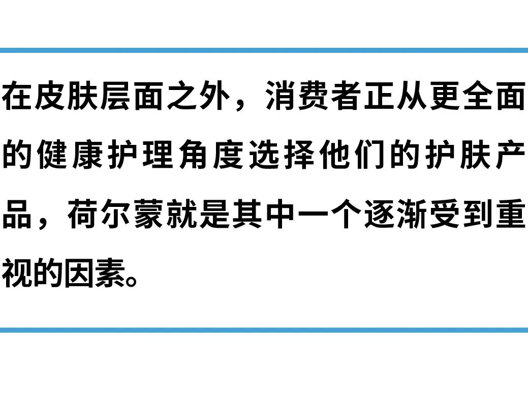 在皮肤层面之外,消费者正从更全面的健康护理角度选择他们的护肤产品,荷尔蒙就是其中一个逐渐受到重视的因素,女性的荷尔蒙水平会在孕期和更年期发生显著变化,月经也会造成荷尔蒙分泌的波动,从而影响皮肤的状况,比如造成痤疮、光敏性、过敏、干燥等问题。