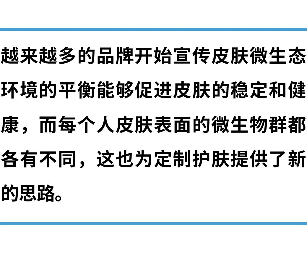 食品及保健品行业多年的市场教育已经让消费者接受这样的观点——身体健康与肠道菌群平衡有着重要关系,近年,“菌群平衡”的概念被引入到护肤领域,越来越多的品牌开始宣传皮肤微生态环境的平衡能够促进皮肤的稳定和健康,而每个人皮肤表面的微生物群都各有不同,这也为定制护肤提供了新的思路。
